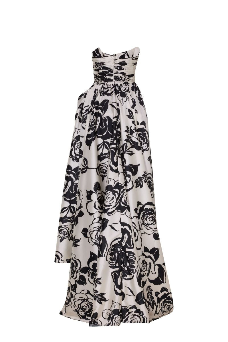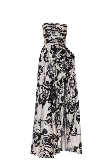 - فستان من التفتا بدون حمالات مع شق مرتفع
