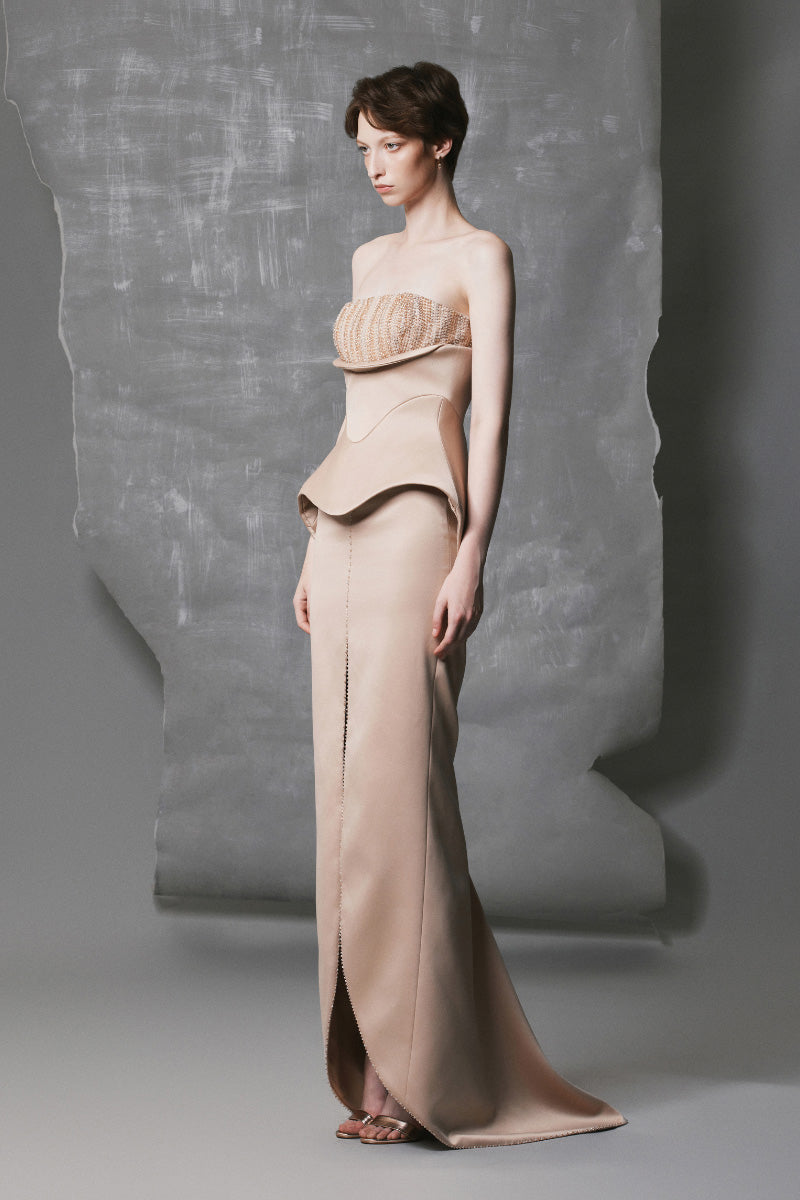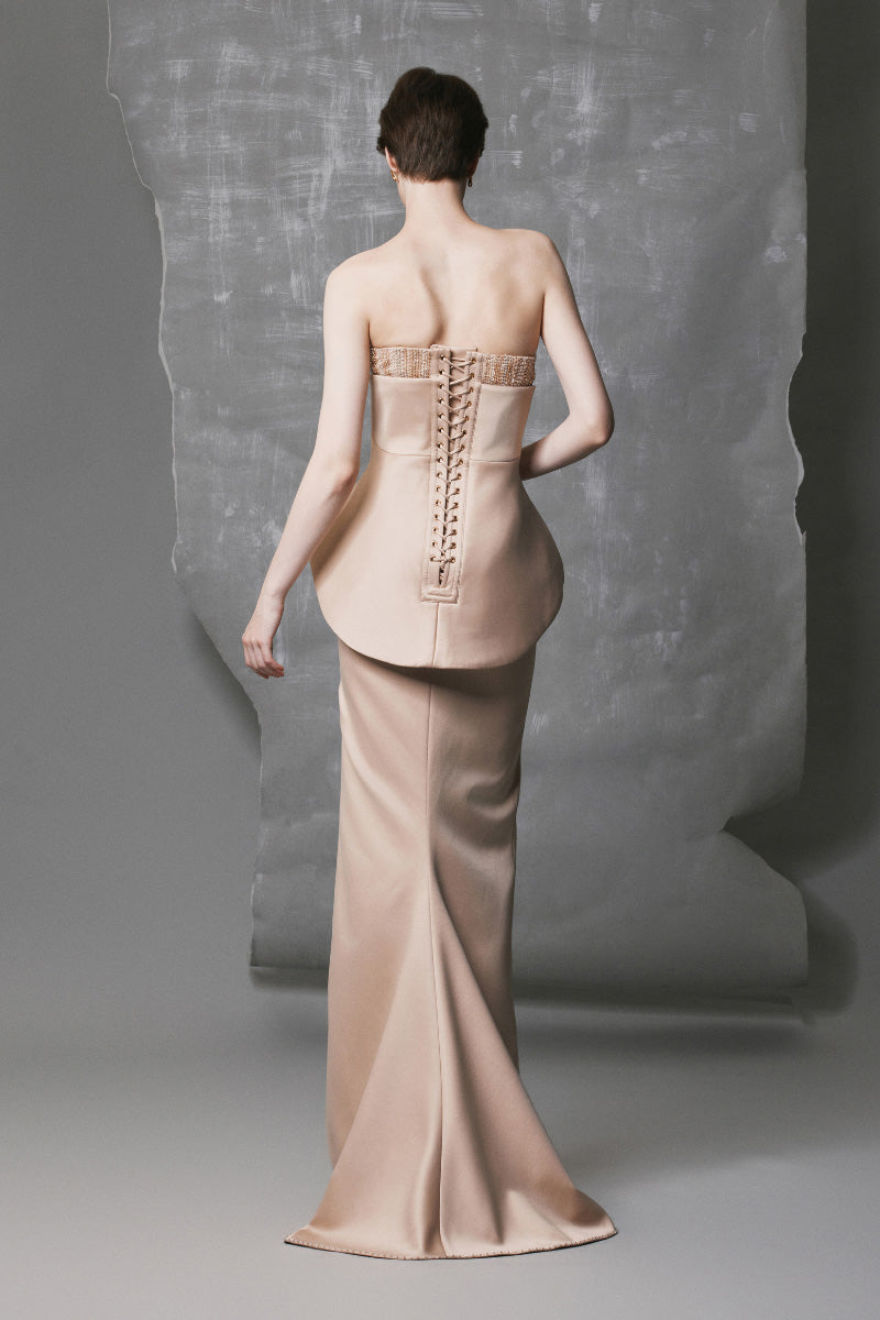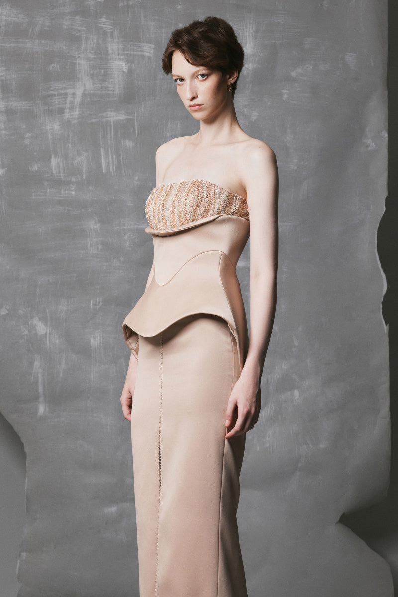 فستان بدون حمالات بلون العاري، مصنوع بدقة من الساتان ذي الوجهين، يتميز بصدرية منحوتة ومهيكلة مزينة بكريستال عمودي وخرز. يتحول خط الخصر إلى تنورة أنيقة وضيقة مع شق أمامي محاط بإطار دقيق من الكريستال المطبق يدويًا.