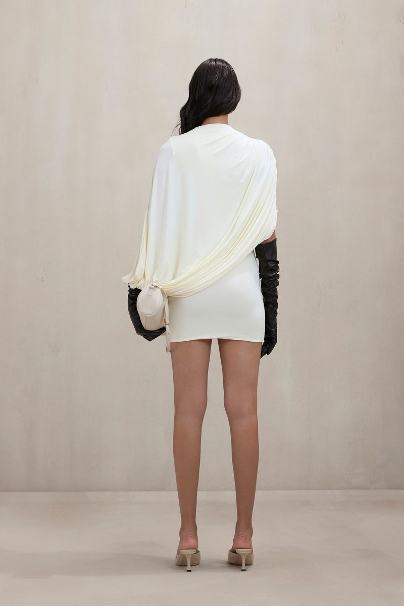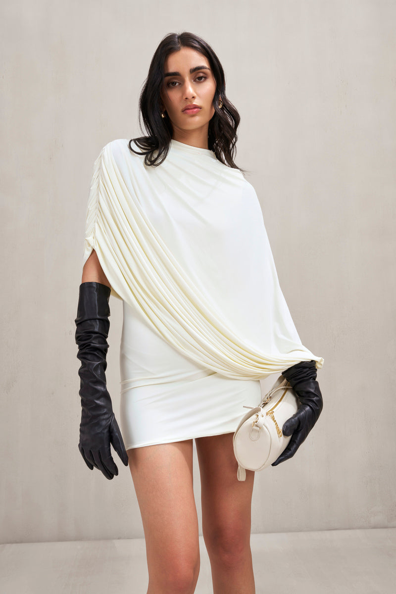 تم تصميم هذا الفستان القصير مع طيات حول الصدر