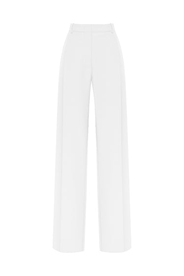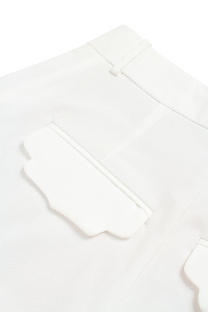 بنطال كيمر الأبيض الكريمي هو بنطال أنيق بقصة مستقيمة من الساتان، مصمم بخصر عالٍ أنيق وثنيات أمامية حادة. تضيف الجيوب الجانبية وجيوب الغطاء الخلفية مزيدًا من العملية، بينما تعيد حواف الجيوب المصممة بشكل مميز تفسير الأقواس ذات الشكل العارضي الموجودة في العمارة الشرقية التقليدية - تكريمًا لزخرفة كيمر ("كيمر" تعني قوس باللغة التتارية القرمية).