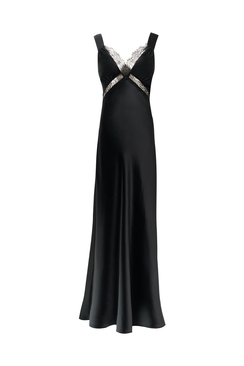 فستان لاتيكا الدانتيلي يوازن بأناقة بين الرقي والجاذبية. أحزمة عريضة مزينة بالدانتيل تُحيط بفتحات رقيقة عند الصدر والظهر، مما يُضفي بُعدًا وجاذبيةً ناعمة. مصنوع من حرير شارموز المرن بكثافة 22 موم، يضفي انسيابية ولمعانًا ناعمًا، بينما ينساب دانتيل الرموش الرقيق على البشرة ليمنحكِ ملمسًا فاخرًا وراقيًا.