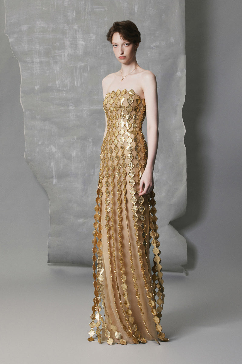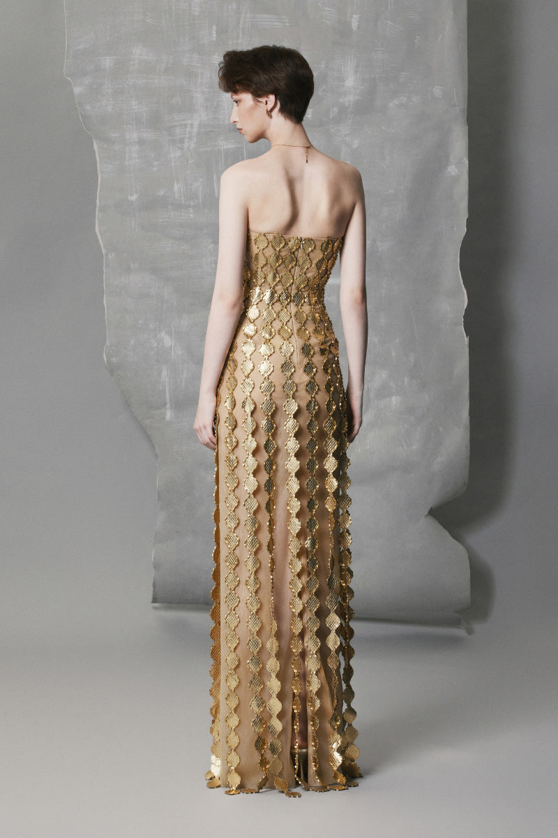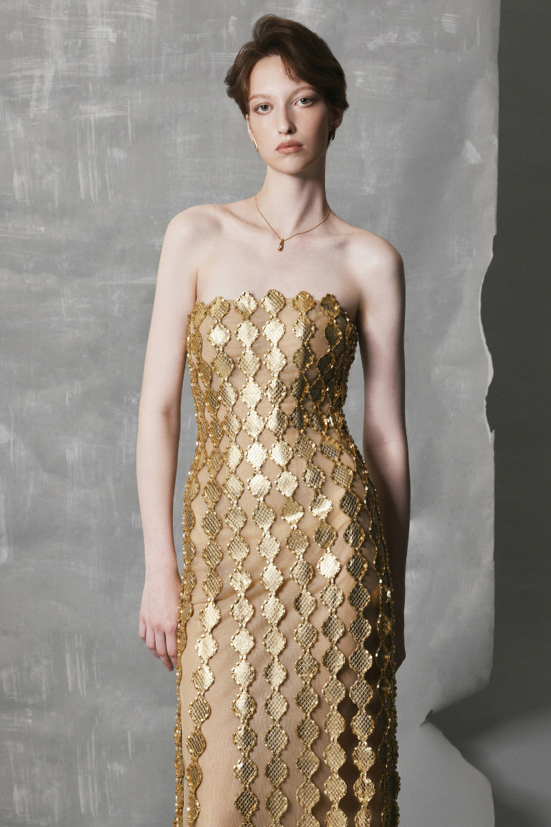 فستان طويل بدون حمالات، مزين بألواح ذهبية عمودية وخرز معدني، مثبت يدويًا من الصدر إلى الوركين، مع ترك الأجزاء السفلية تنساب بحرية. تصميمه يضفي حركة انسيابية وانعكاسًا مضيء.