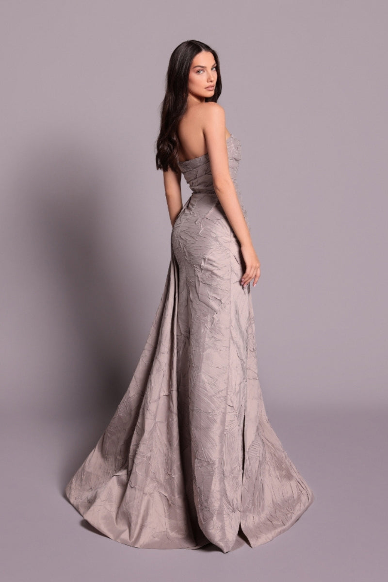 - فستان من التفتا المتفتت مع فيونكة من الخرز وشق