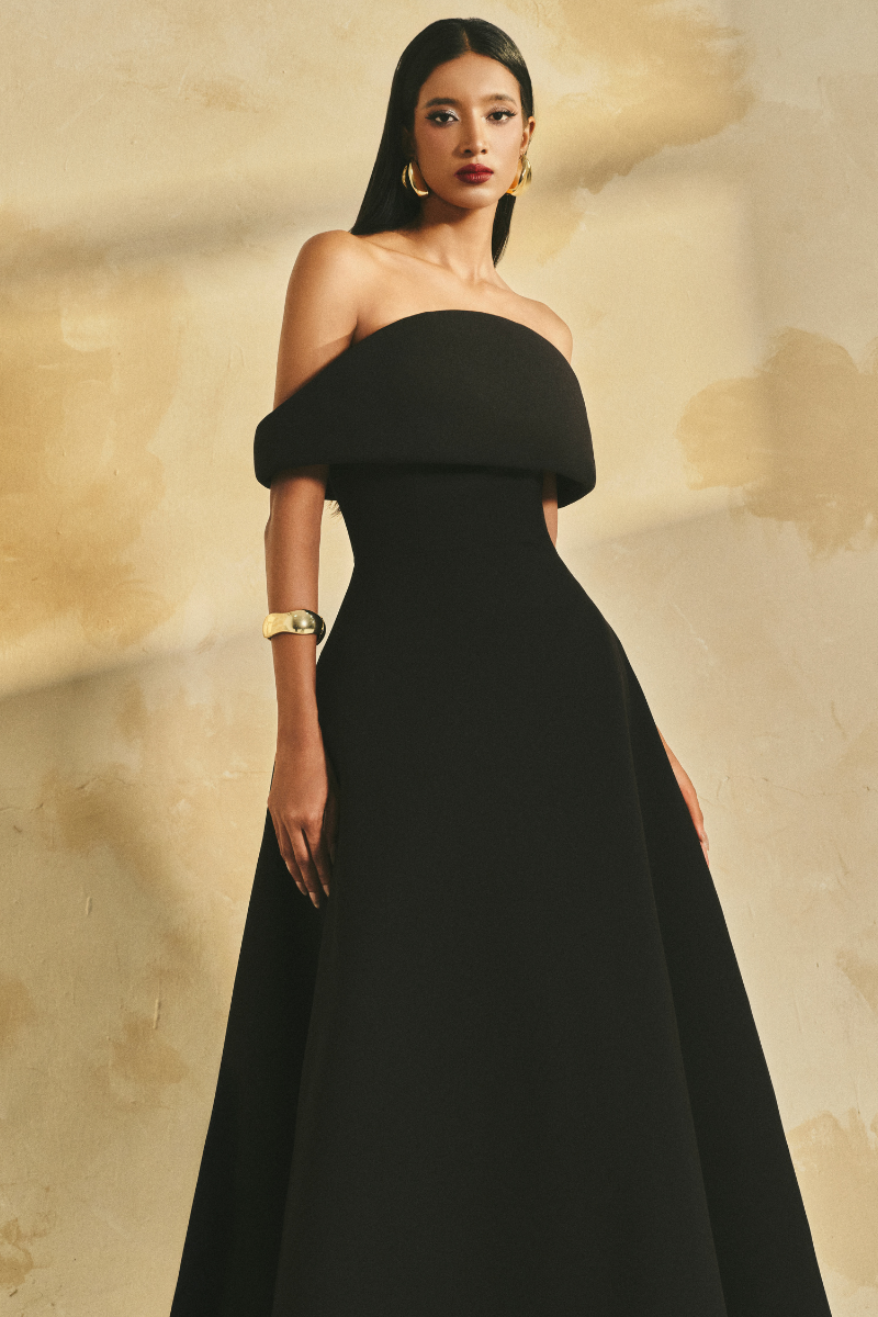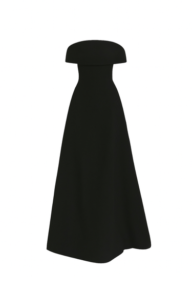 - فستان طويل الأكمام مكشوف الكتفين مصنوع من قماش الكريب البوليستر الفاخر