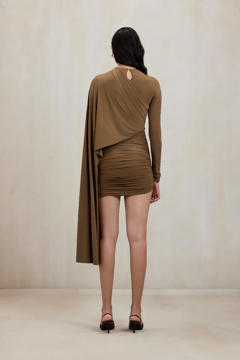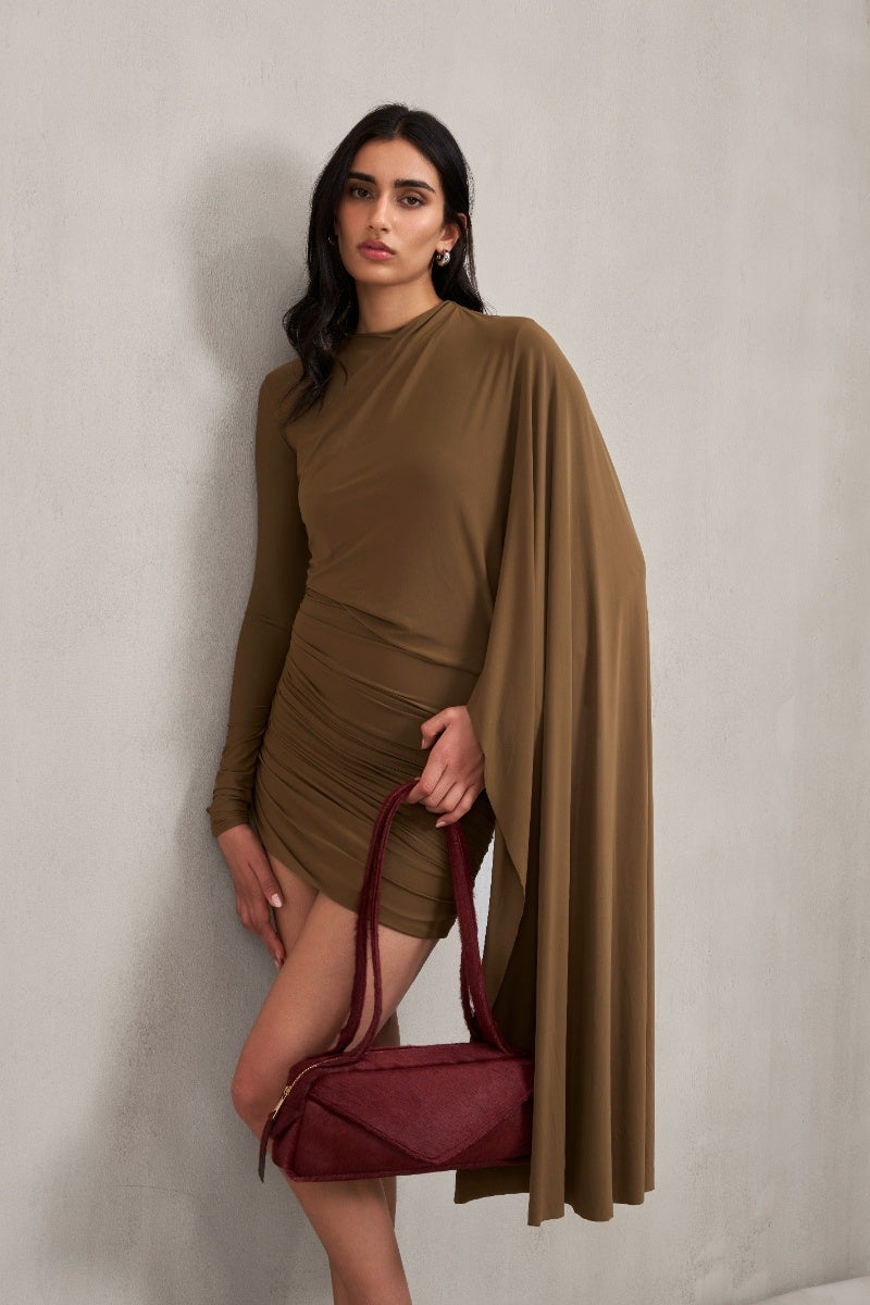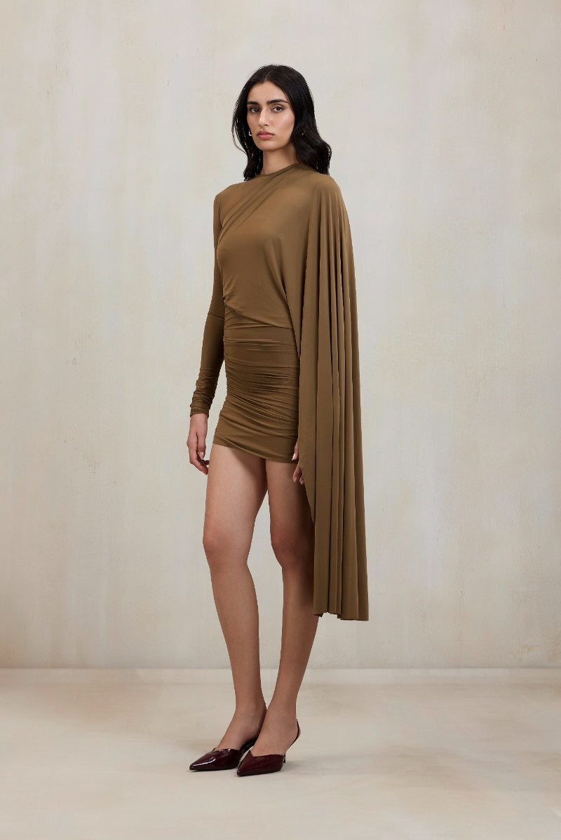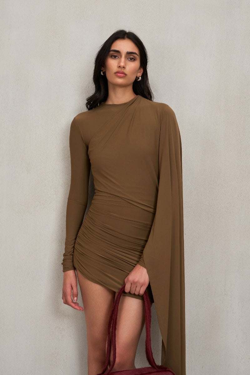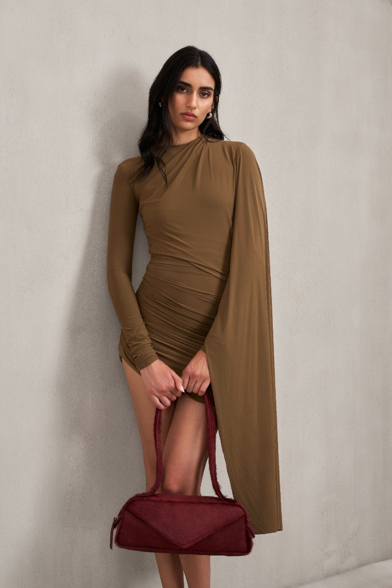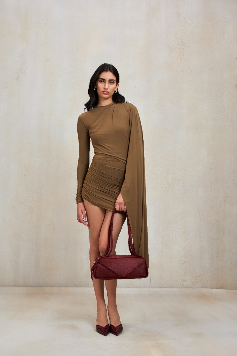تتميز القطعة بتفاصيل مثيرة للأكمام الطويلة على أحد الجانبين، ومتوازنة بشكل مثالي مع شكلها الصغير المكشكش وفتحة العنق العالية.