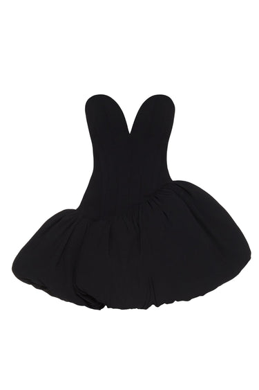 تنورة فضفاضة بخياطة غير متماثلة تنساب بسلاسة على صدرية الكورسيه، متوازنة مع فتحة رقبة عميقة على شكل حرف V. ورغم تفاصيله الجريئة، يحافظ الفستان على تماسكه وأناقته العفوية.