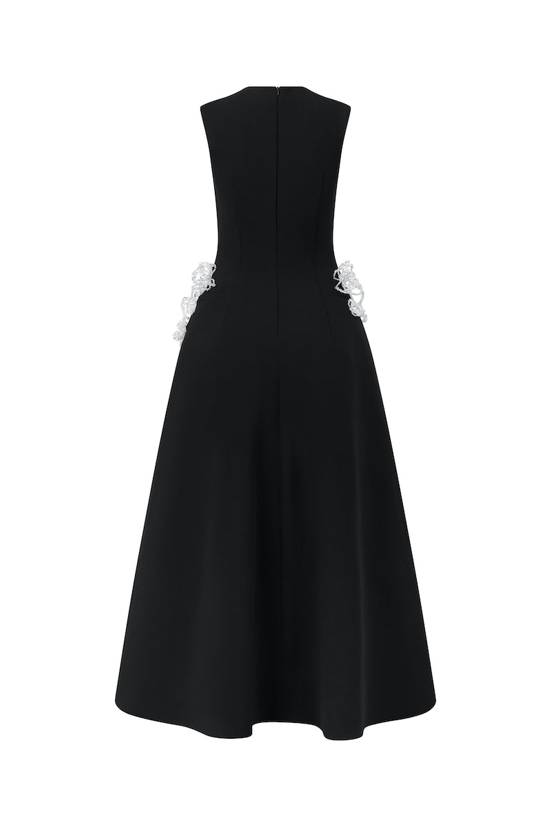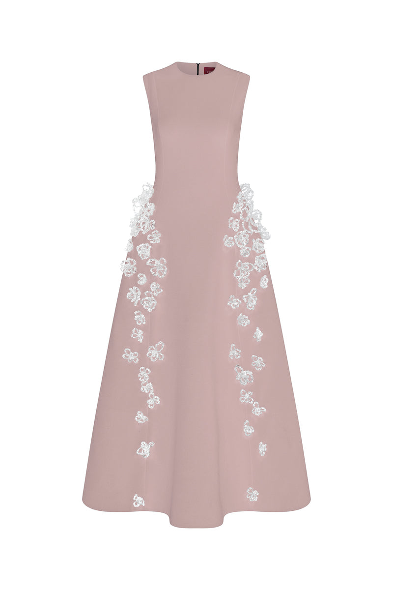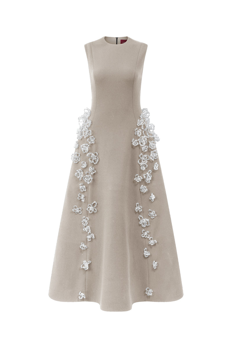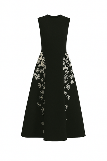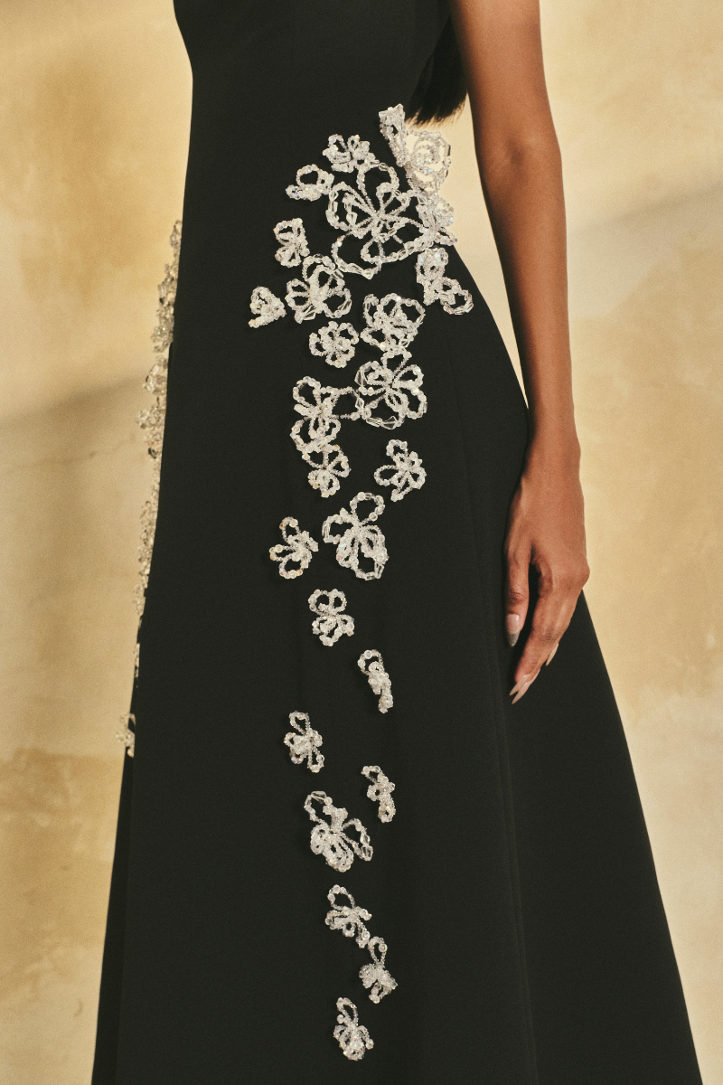 - تطريز يدوي ثلاثي الأبعاد من الكريستال على شكل زهور يتدفق على الصدر