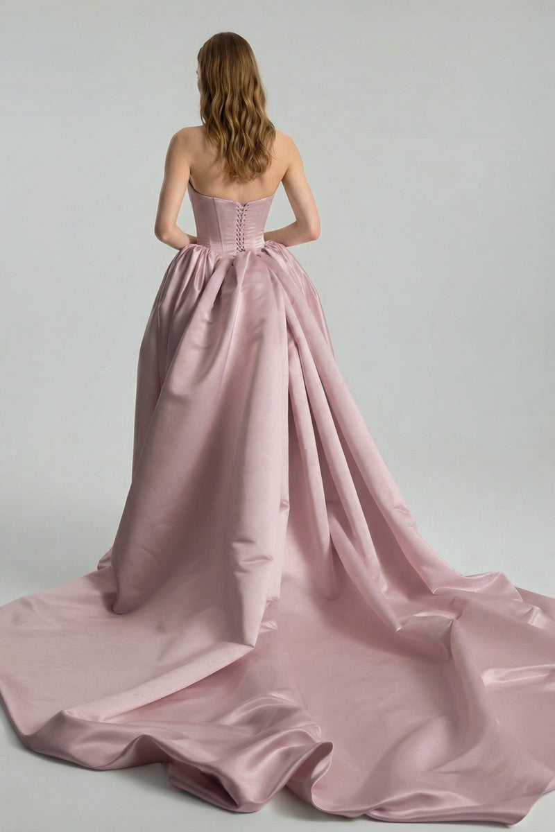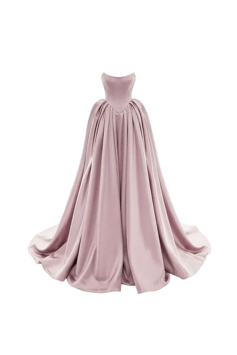 فستان أنيق يتميز بكورسيه ناعم ذي تصميم متقن وتنورة واسعة.