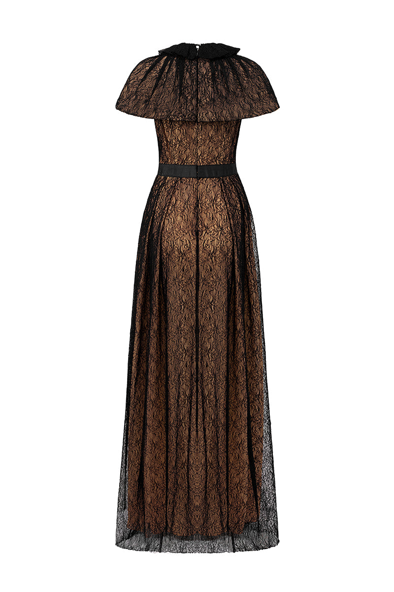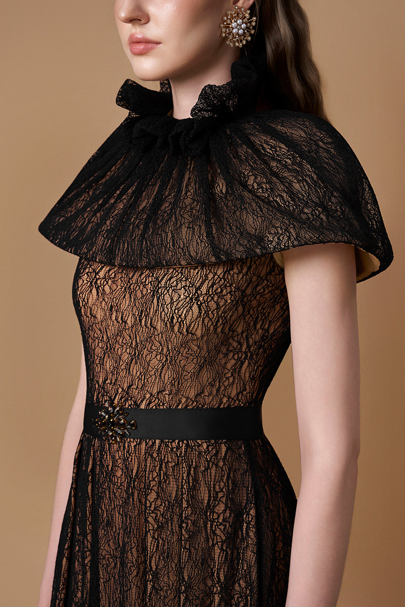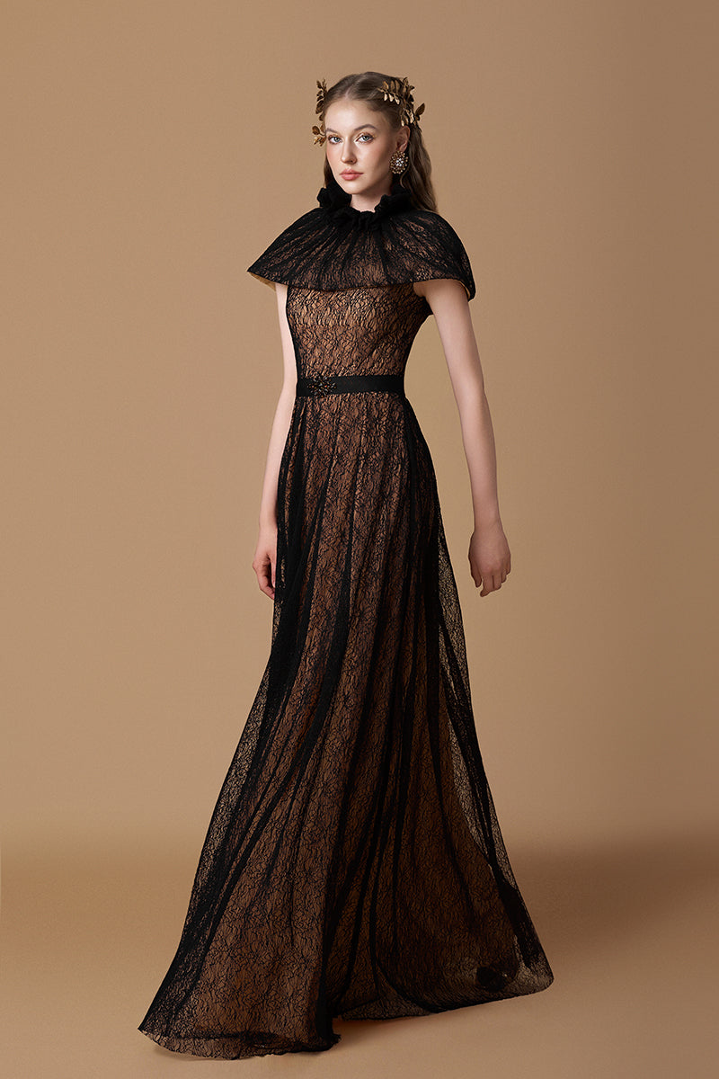 يُقدّم فستان السهرة ذو القصة المستقيمة مع الرداء القصير المصنوع من دانتيل غيبور بنقشة الكرمة، إطلالةً أنيقةً تجمع بين الرقي والجاذبية الكلاسيكية. صُمّم الفستان من دانتيل رقيق بنقشة الكرمة، ليُبرز جمال القوام بانسيابية قبل أن ينسدل في نهاية ناعمة على شكل حرف A. يضفي الياقة العالية والرداء القصير المُصمّم بدقة توازناً أنيقاً، بينما يُبرز حزام الخصر المُرصّع بدبوس مرصّع بالجواهر جمال الخصر. تضمن المرونة الطفيفة راحةً وانسيابيةً في القوام، مع حركة رشيقة تُضفي لمسةً جماليةً على من ترتديه.
