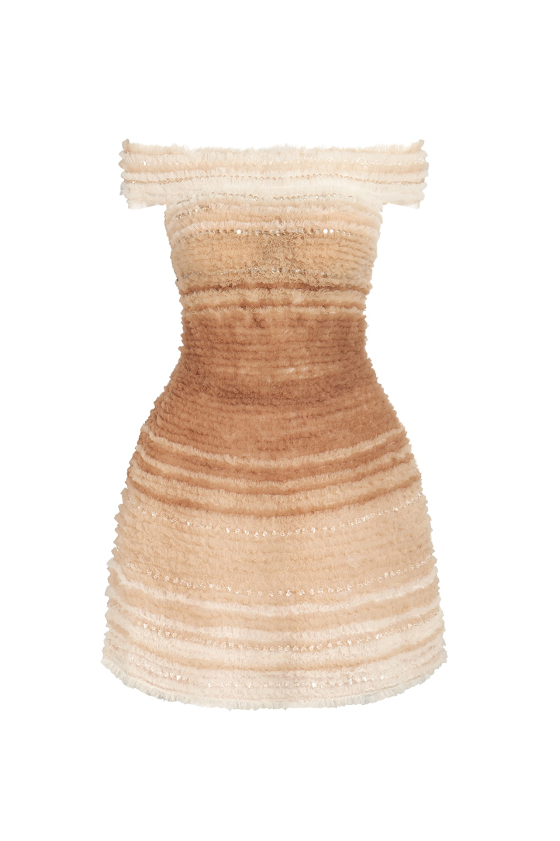 هذا الفستان القصير المتدرج هو عرض مذهل للأناقة الدقيقة. يضيف الانتقال المتدرج من اللون البني الداكن إلى الألوان الكريمية جاذبية بصرية آسرة، مما يخلق إحساسًا بالسيولة والحركة. تزين الكشاكش الصغيرة الرقيقة الفستان، مما يضيف لمسة غريبة من الملمس والأنوثة إلى التصميم. يعزز الطول الصغير للفستان سحره الجذاب، بينما يضيف نظام الألوان المتدرج عمقًا وبعدًا إلى المظهر العام.