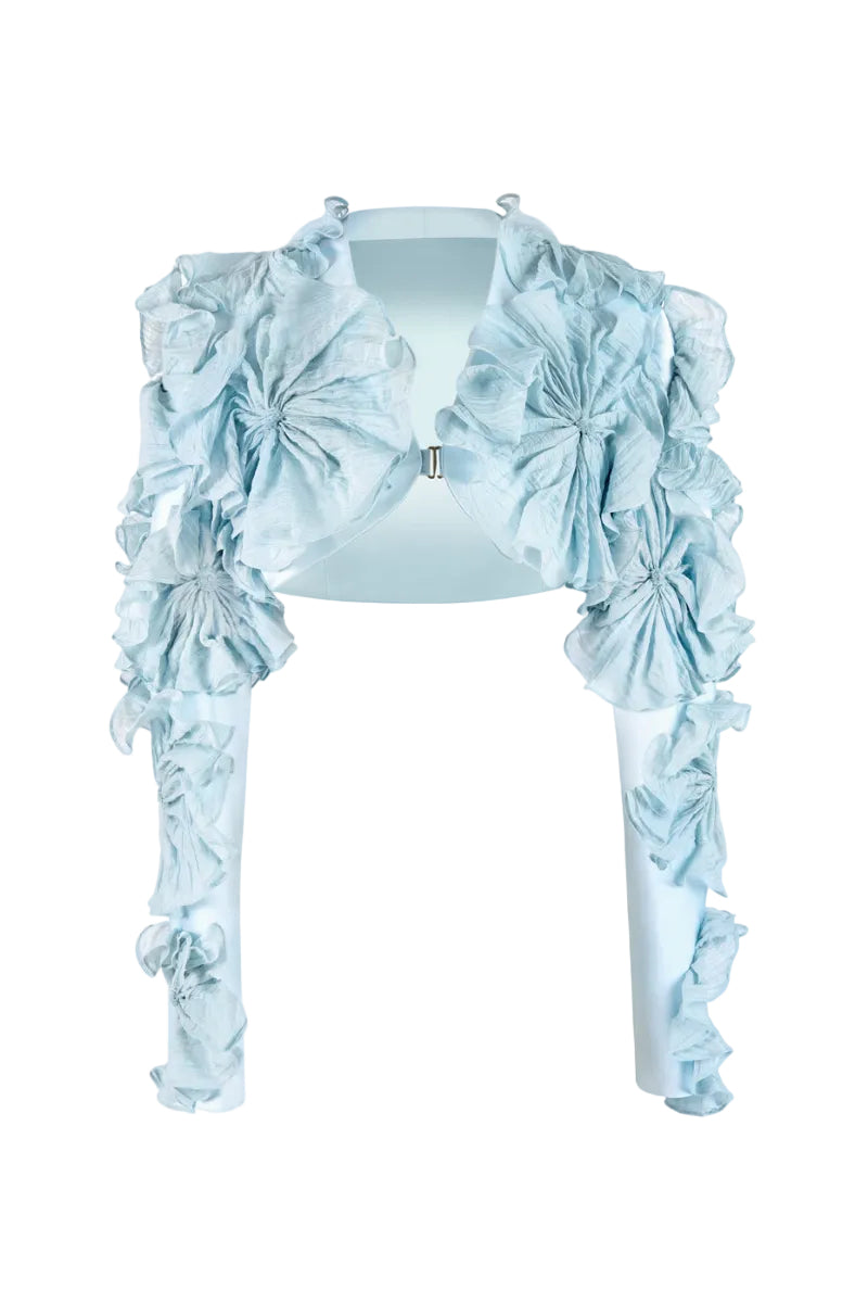 مستوحى من الشكل الطبيعي لورقة اللوتس، يلتف هذا البوليرو حول الجسم في حركة وذكريات. تحاكي الثنيات المخيطة يدويًا والتجاعيد الرقيقة الطيات الناعمة والعضوية الموجودة في الطبيعة - كل منها تذكير هادئ بالتغيير، وعدم الثبات، وملمس المشاعر.