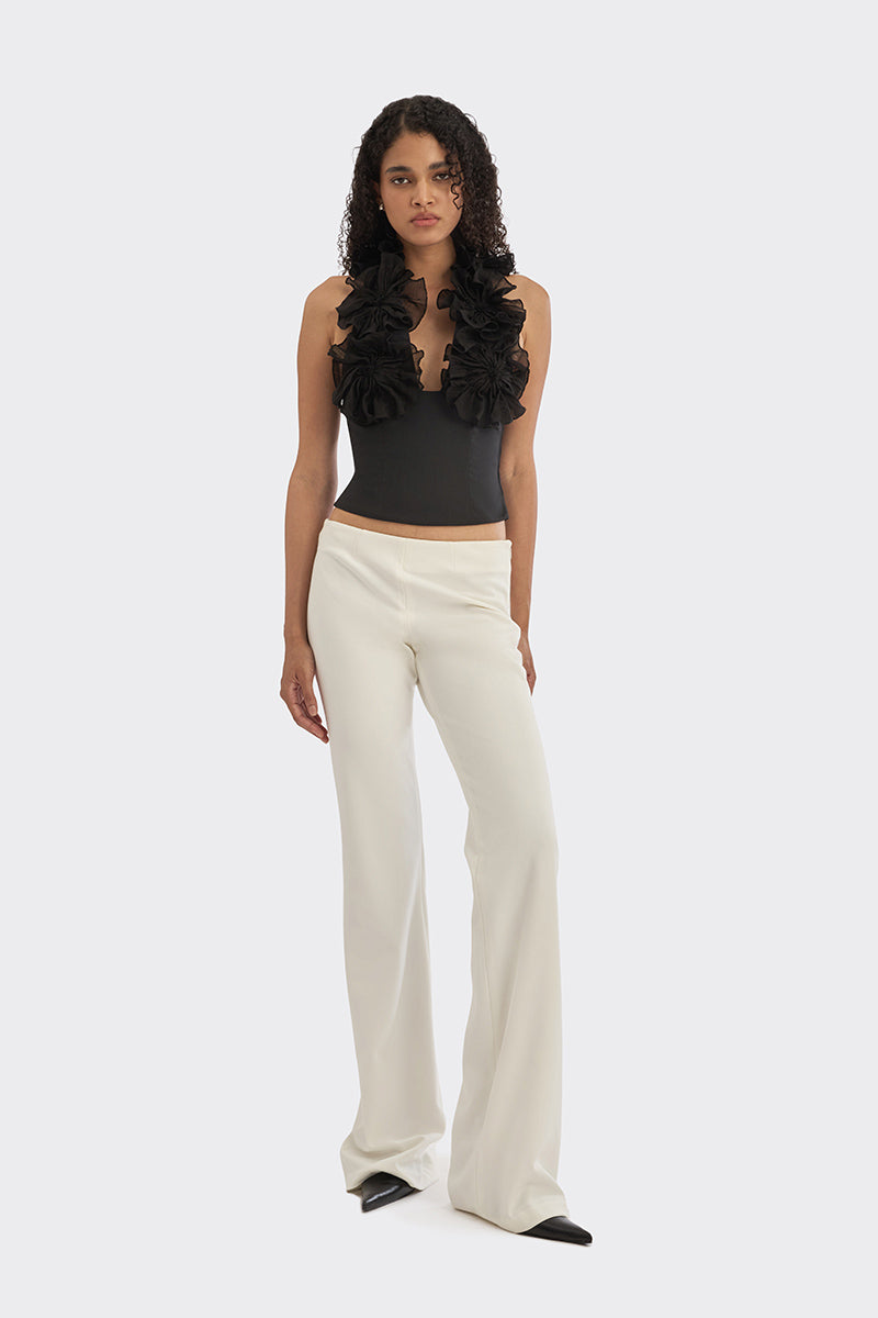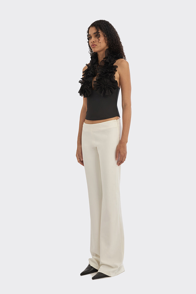- نقشة ورقة اللوتس المتشكلة من خلال ثنيات مخيطة يدويًا عند الصدر، تستحضر طيات عضوية من ذكريات الطفولة
