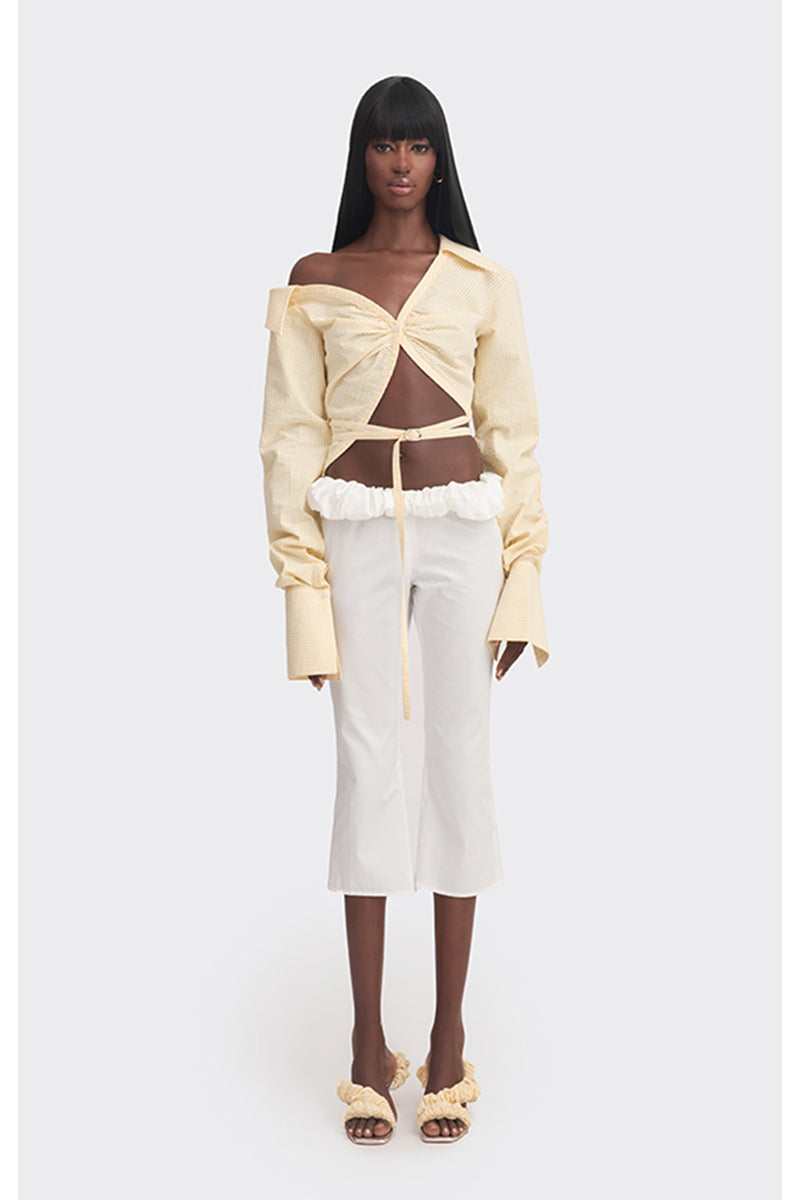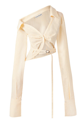 قميص قصير مخطط مكشوف الكتفين باللون الأصفر