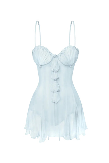 مستوحى من شكل الصدف ومصمم بنعومة، يجسد هذا الفستان القصير إيقاع البحر الهادئ. تعكس حمالات الصدر المنسدلة يدويًا المنحنيات الطبيعية للصدفة، بينما تضفي قطع الشيفون المزينة بثنيات على شكل مثلثات وحافة متطايرة خفةً على كل خطوة.