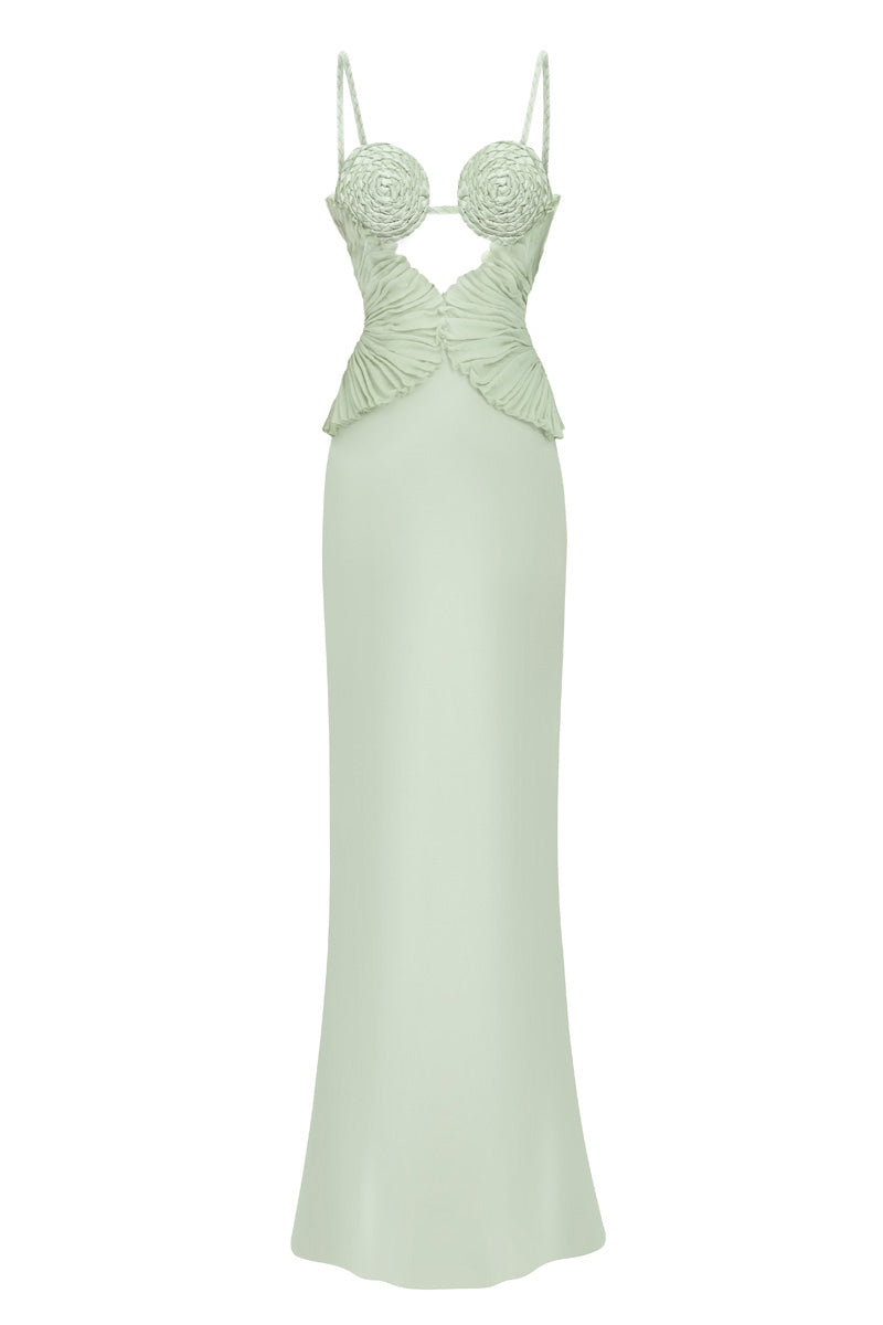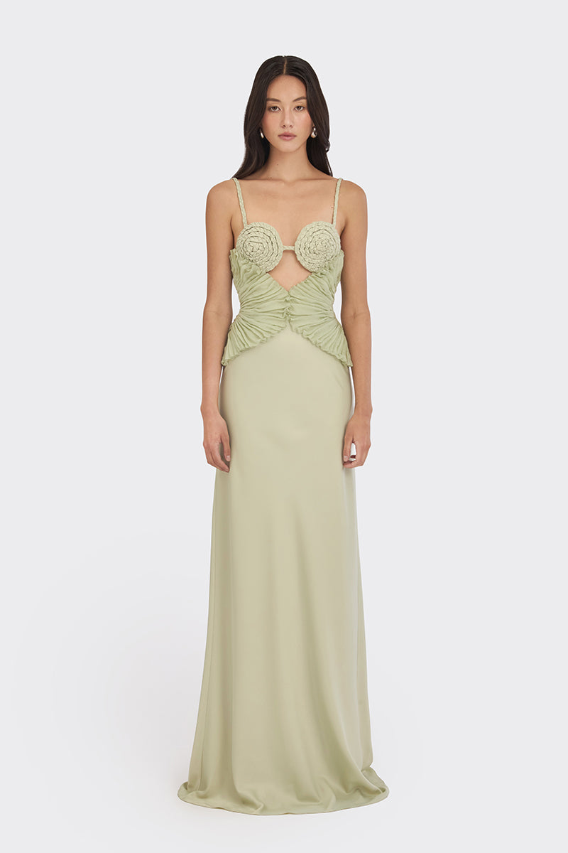 يستوحي فستان ماكسي "سبيرال ليف" تصميمه أيضاً من زهرة اللوتس، فشكله الدائري الرقيق مرتبط ارتباطاً وثيقاً بطفولة التايلانديين وسكون البوذية. تلتقي الحلزونات المضفرة يدوياً مع طيات اللوتس المطرزة، معبرةً عن التوتر العاطفي والتحرر الهادئ.