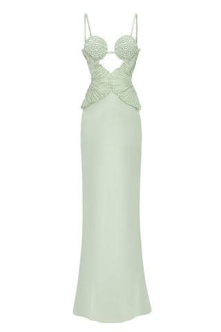 فستان ماكسي أخضر بنقشة أوراق اللوتس الحلزونية