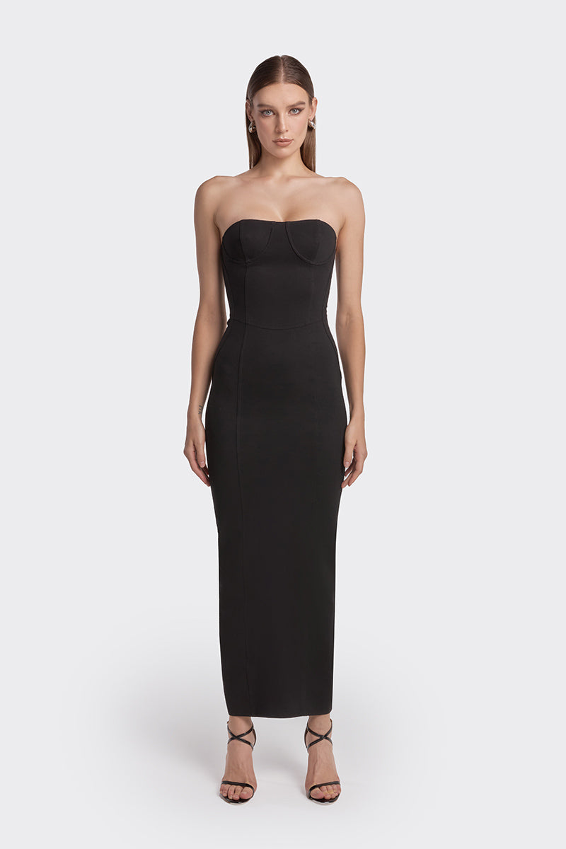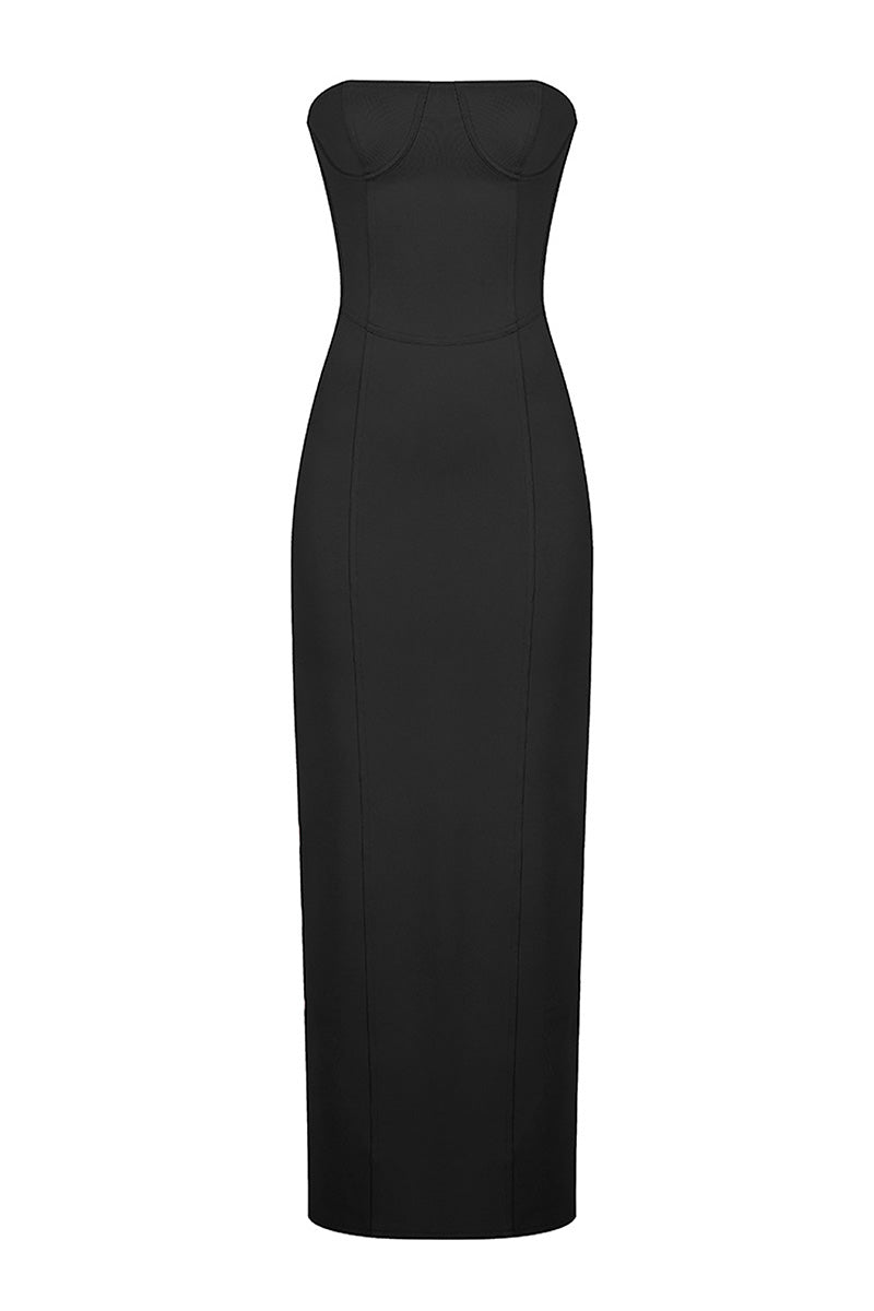 فستان أسود متوسط الطول بدون حمالات