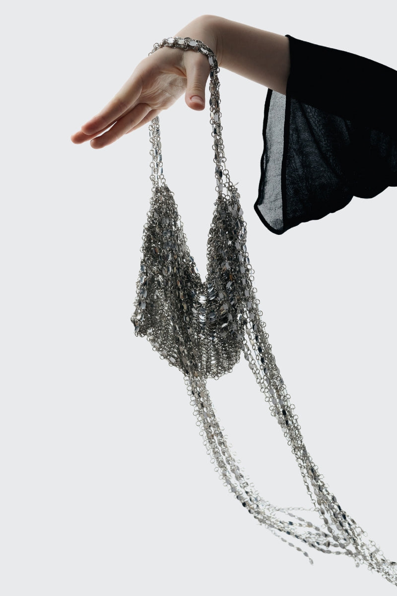 حقيبة يد مثالية مصنوعة من بلورات صغيرة منسوجة بشكل معقد معًا لإنشاء حقيبة يد ممتعة وحديثة، مثالية للمناسبات الخاصة.