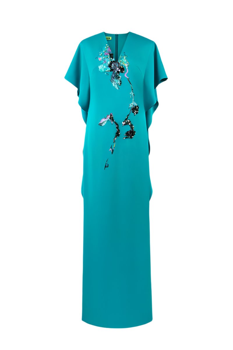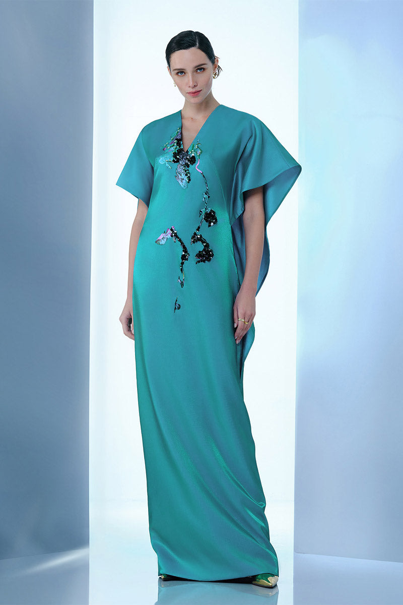 فستان خشخاش الهيمالايا - مستوحى من زهور الخشخاش الزرقاء الرائعة في جبال الهيمالايا، يتميز هذا الفستان بلون فيروزي نابض بالحياة مزين بزخارف معقدة مرسومة يدويًا ومزينة بالترتر تذكرنا باللمسة الفنية للطبيعة. تضفي الأكمام المنسدلة والقصّة المستقيمة الأنيقة لمسة من الأناقة الراقية والبساطة العصرية.