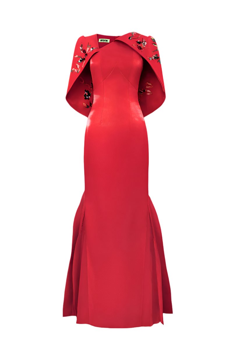 أغنية الحرية - يستحضر هذا الفستان سحر الاستقلال والتمكين، وهو احتفال بالحرية في أنقى صورها. يرمز اللون الأحمر المتألق إلى العاطفة والحيوية، بينما تتحد الزخارف الزهرية المعقدة المرسومة يدويًا مع الزخارف الدقيقة. يتم رفع الصورة الظلية المنظمة من خلال تصميم عباءة درامي، مما يخلق تناغمًا مذهلاً بين القوة والنعمة.