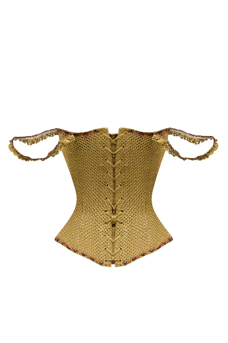 هذا الكورسيه مصنوع يدويًا من خيوط معدنية فاخرة، يلمع ببريق ذهبي. مزين بتطريز يدوي وزهور مصنوعة يدويًا من خرز زجاجي. تصميم الكورسيه مستوحى من كورسيه عتيق من أواخر القرن التاسع عشر، ويتميز بعظام معدنية في المنتصف، مما يُضفي شكل الساعة الرملية على أي شكل. يوفر الرباط في الخلف ملاءمة مثالية لمختلف أشكال الجسم. يتناسب الكورسيه بشكل مثالي مع أي تنانير أو سراويل أو جينز.