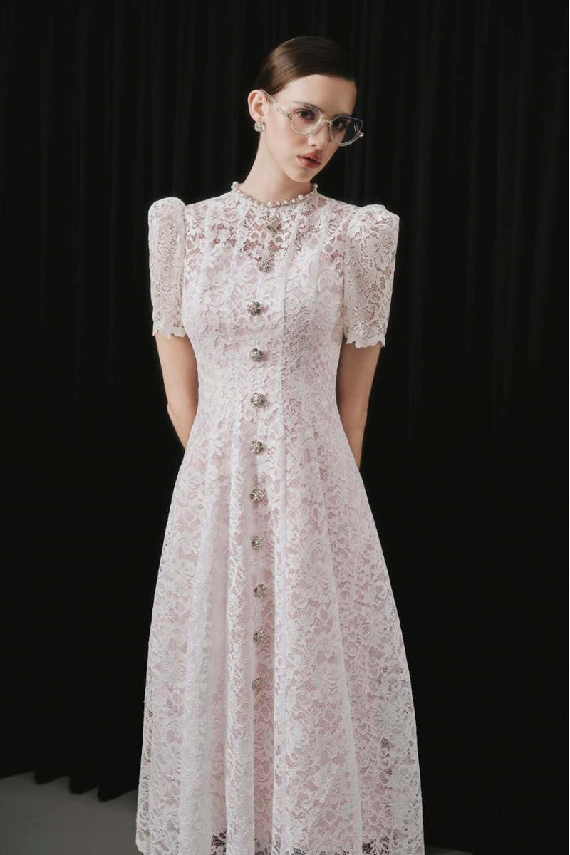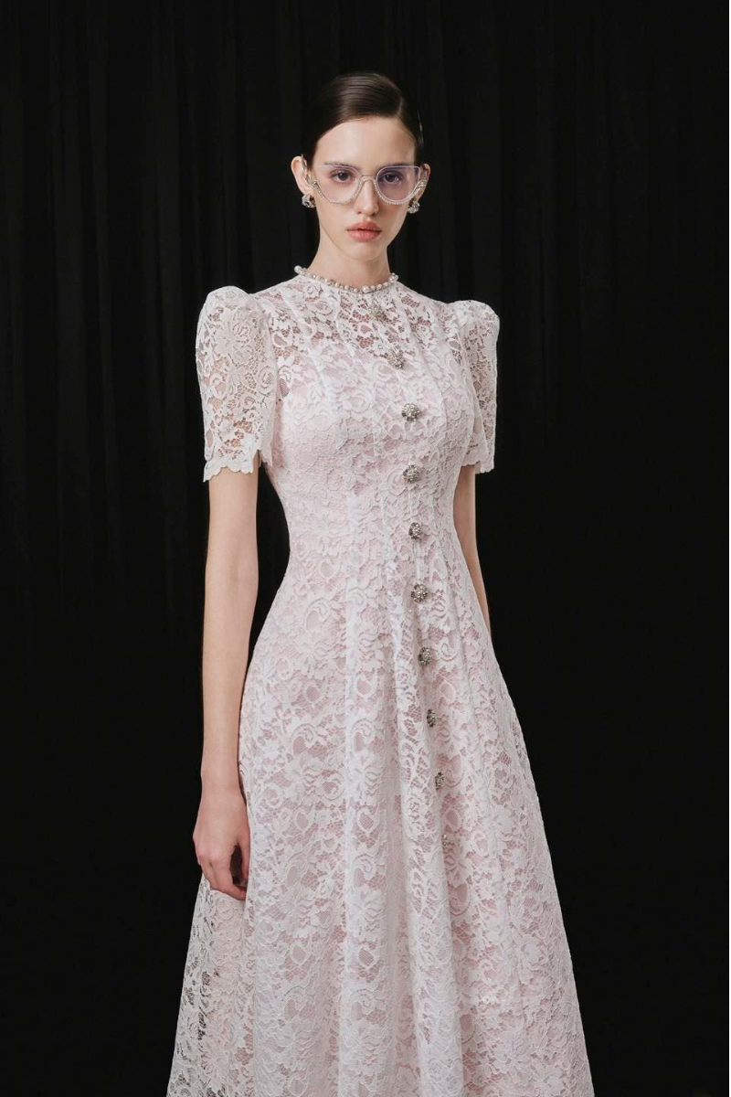 - طبقة من الدانتيل الشفاف بأكمام قصيرة منفوخة لإضفاء سحر عتيق
