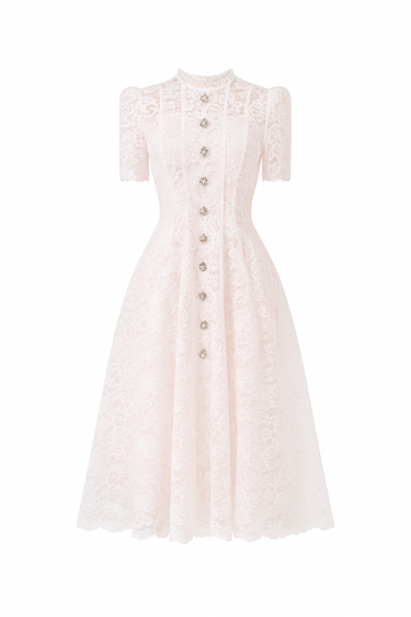 - فستان متوسط ​​الطول من الدانتيل باللون الوردي الفاتح مع تصميم على شكل حرف A