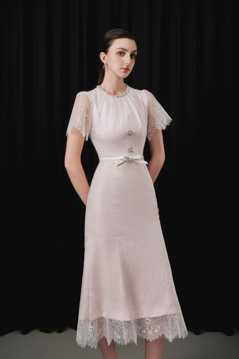- فستان متوسط الطول من الدانتيل باللون الوردي الناعم مع تصميم أنثوي رفيع