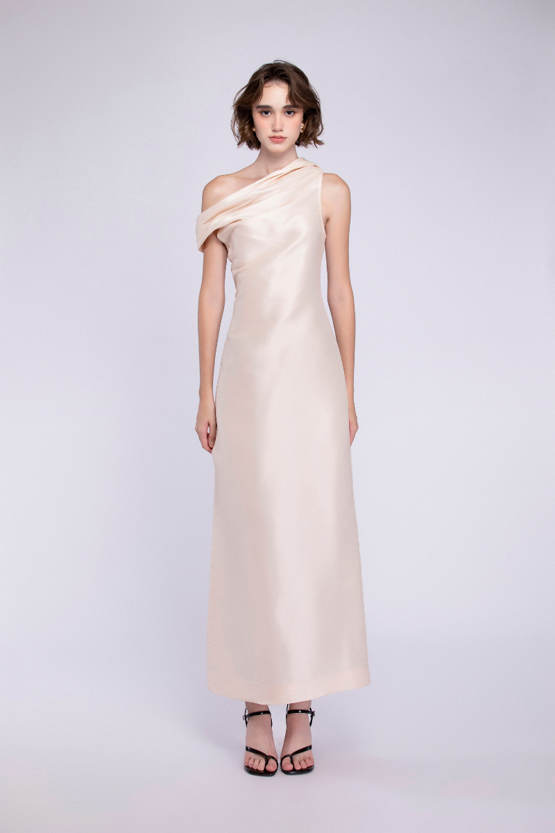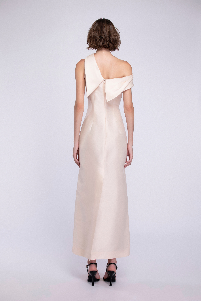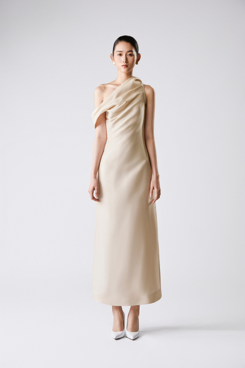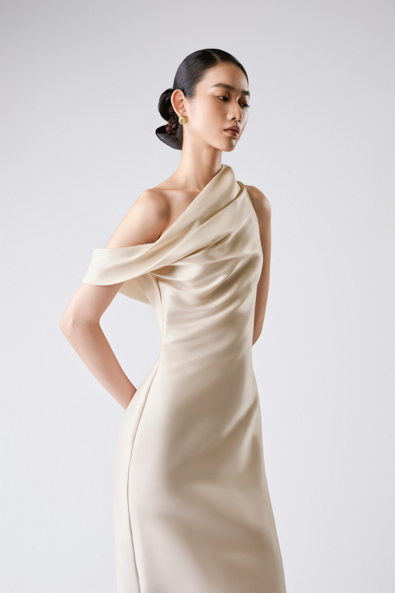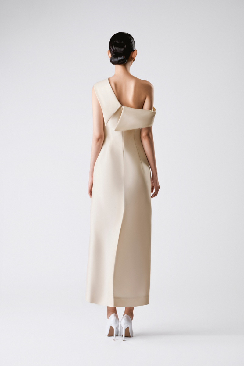 تصميم غير متماثل مصنوع من الأورجانزا الحريرية، يجمع بين السلاسة والدقة في التصميم. ينحت الخصر المنحني قوام الفستان، محققًا توازنًا متناغمًا بين البساطة والانضباط المعماري.