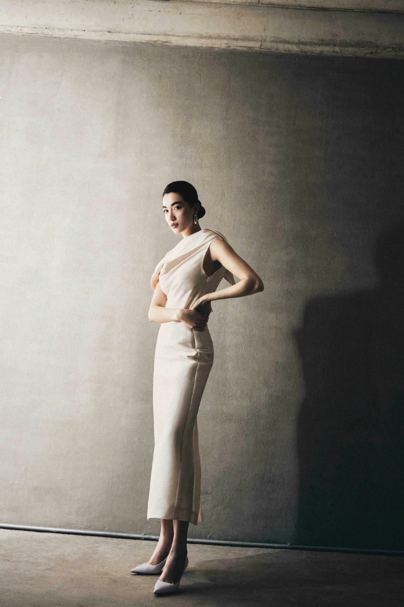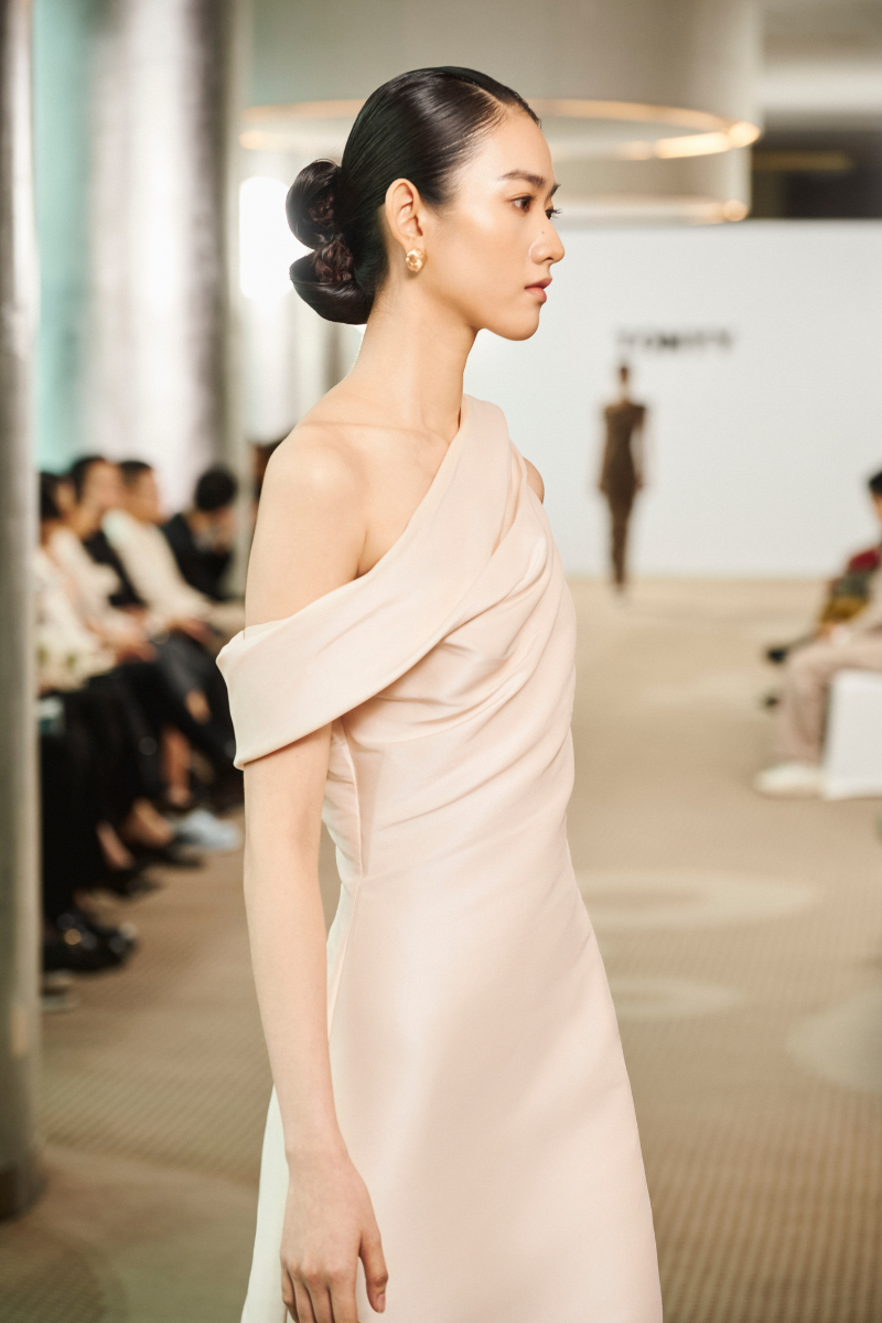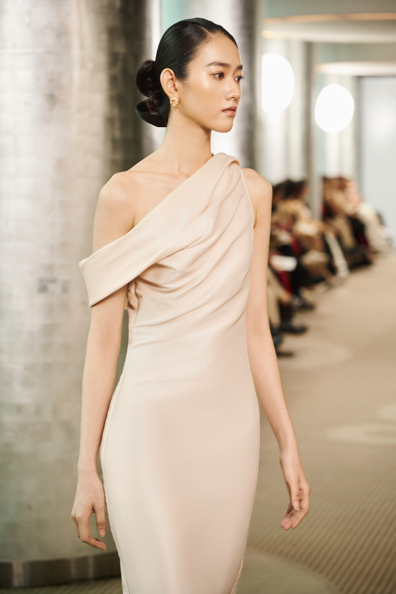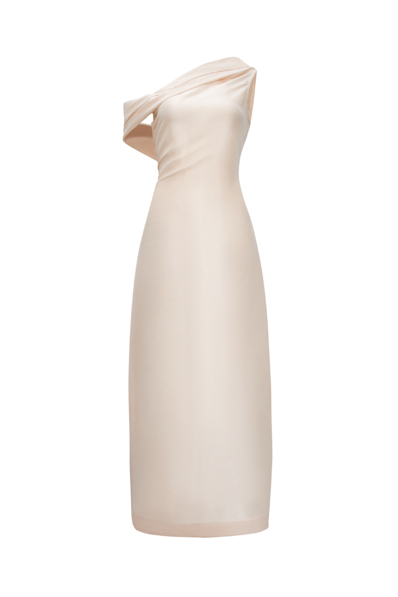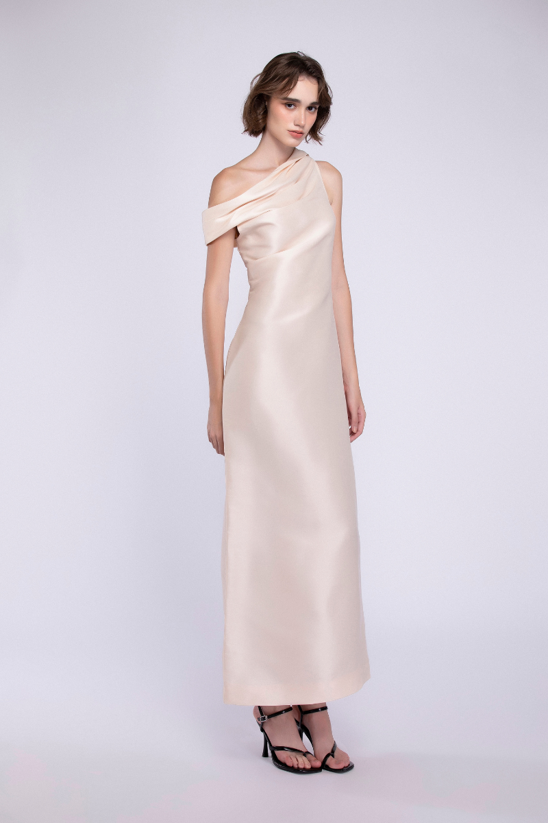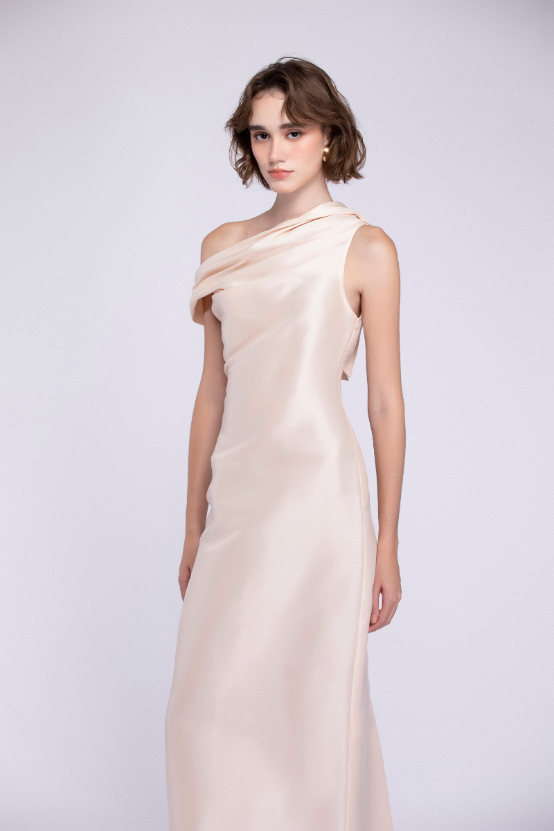 تصميم غير متماثل مصنوع من الأورجانزا الحريرية، يجمع بين السلاسة والدقة في التصميم. ينحت الخصر المنحني قوام الفستان، محققًا توازنًا متناغمًا بين البساطة والانضباط المعماري.