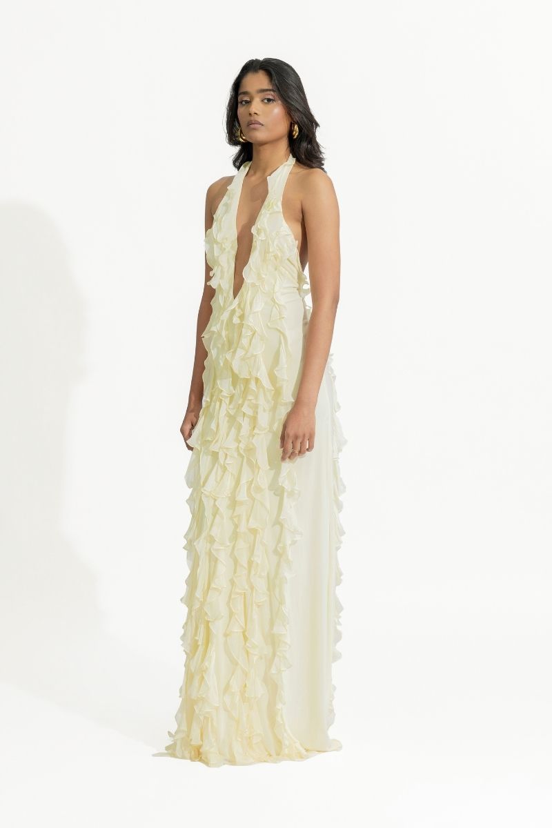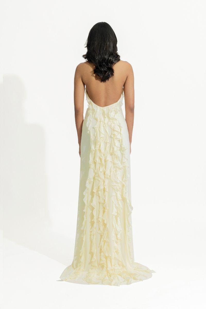 يتميز الفستان ذو الرقبة على شكل حرف V العميق بكشكشة متدفقة مذهلة وتصميم ظهر مكشوف مذهل.