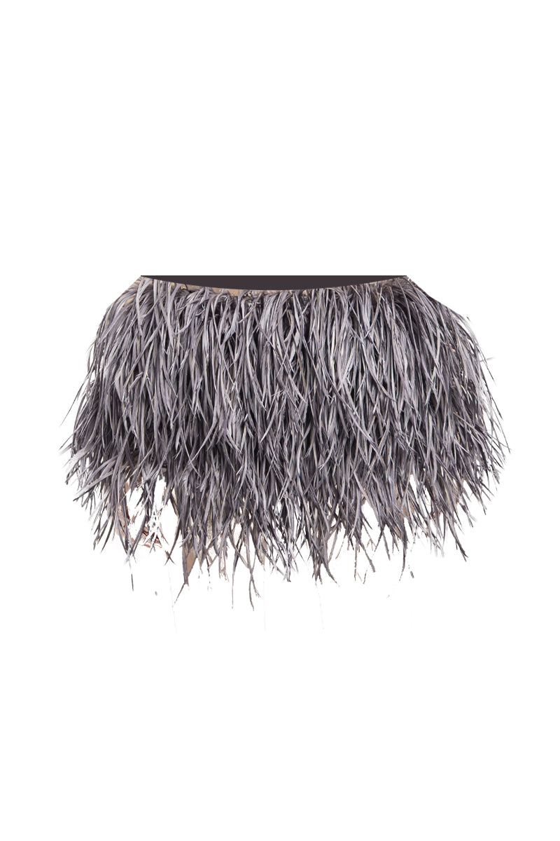 تنورة الريش الرمادية القصيرة خفيفة الوزن، رقيقة، وجذابة بلا شك، تُضفي لمسةً من الأناقة الراقية. مصنوعة يدويًا بريش مُخيط بشكل فردي على واجهتها الأمامية، تُضفي مظهرًا كثيفًا ومُحكمًا يتناغم مع الحركة. يُوازن الجزء الخلفي الأنيق والمُهيكل الشكل، مما يُضفي بريقًا على الريش مع ضمان ملاءمة مثالية.