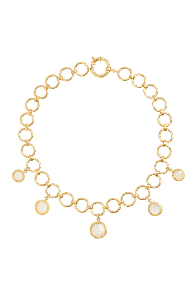- ارتقِ بمجموعة مجوهراتك مع هذا العقد الدائري المذهل المصنوع من الفضة الإسترلينية المطلية بالذهب عيار 18 قيراطًا، والذي يتميز بحلي عرق اللؤلؤ المصممة بشكل معقد والتي تجسد الأناقة الطبيعية لأشكال الأرض الخام والعضوية. كل حلية، بلمعانها اللامع وشكلها الدائري، تضفي حضورًا رقيقًا وجريءًا على خط رقبتك. يتوازن التصميم البسيط للعقد مع المواد الفاخرة، مما يخلق قطعة متطورة تتدلى بشكل جميل.