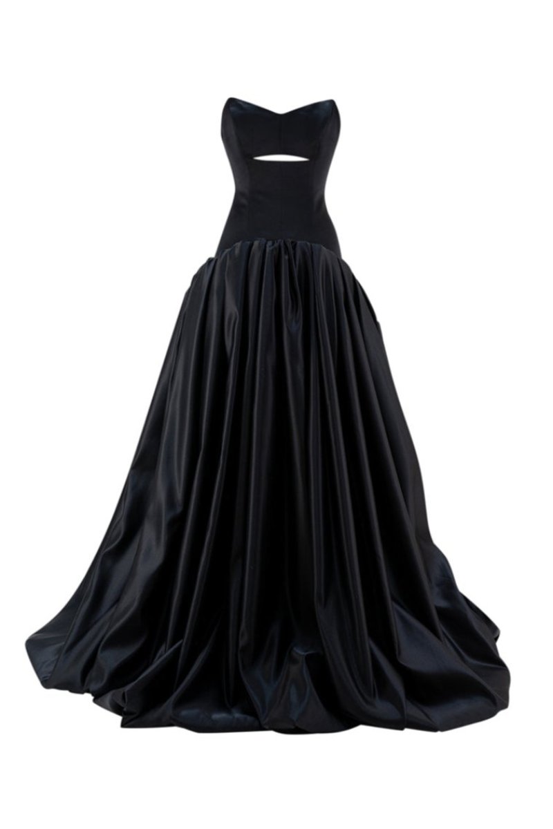 فستان كورسيه أسود بدون حمالات يتميز بفتحة رقبة أنيقة أسفل الصدر مباشرة وخصر منخفض. تتناقض التنورة الضخمة بشكل جميل مع الصورة الظلية الأنيقة للكورسيه. يمزج هذا التصميم البسيط بسلاسة بين البنية الحديثة والأناقة الخالدة