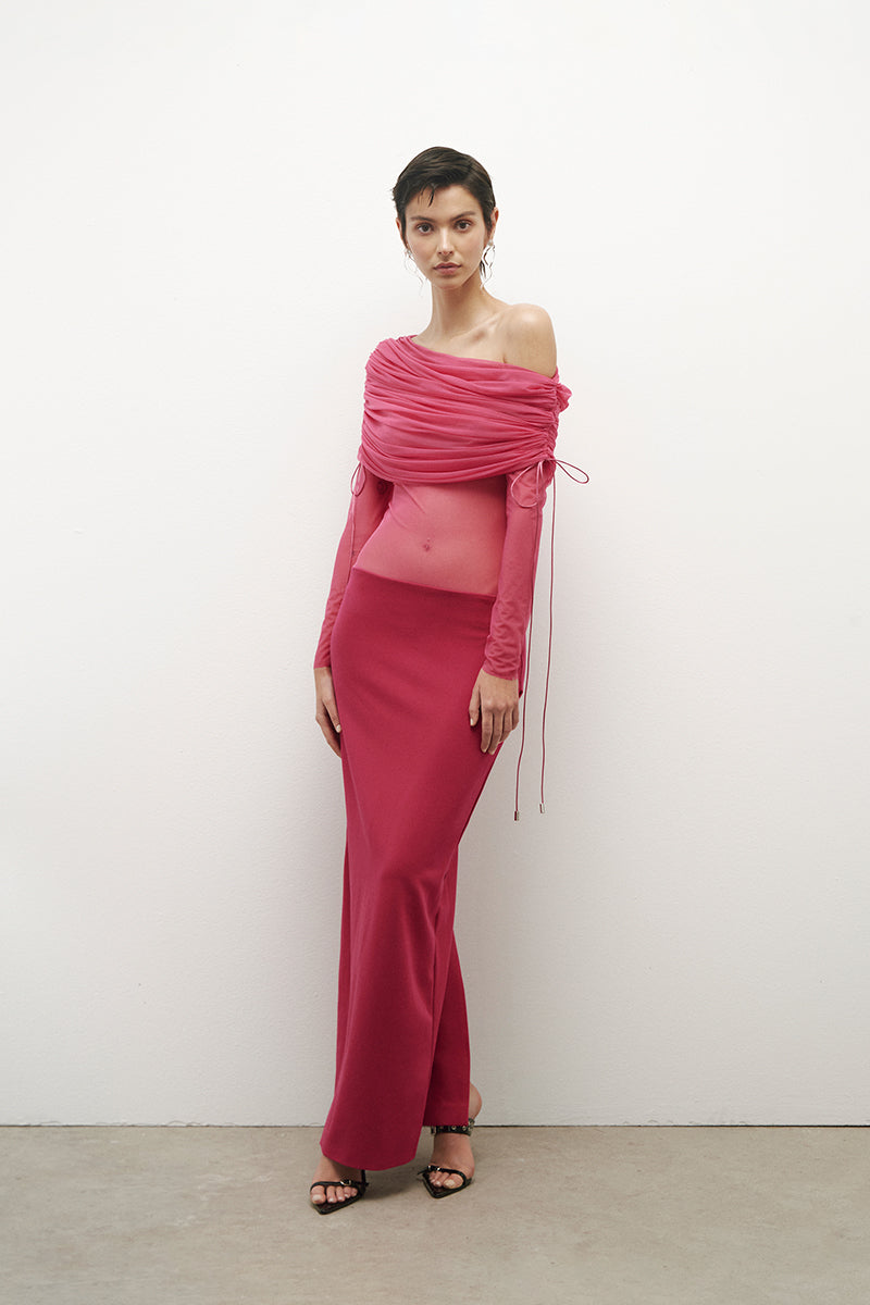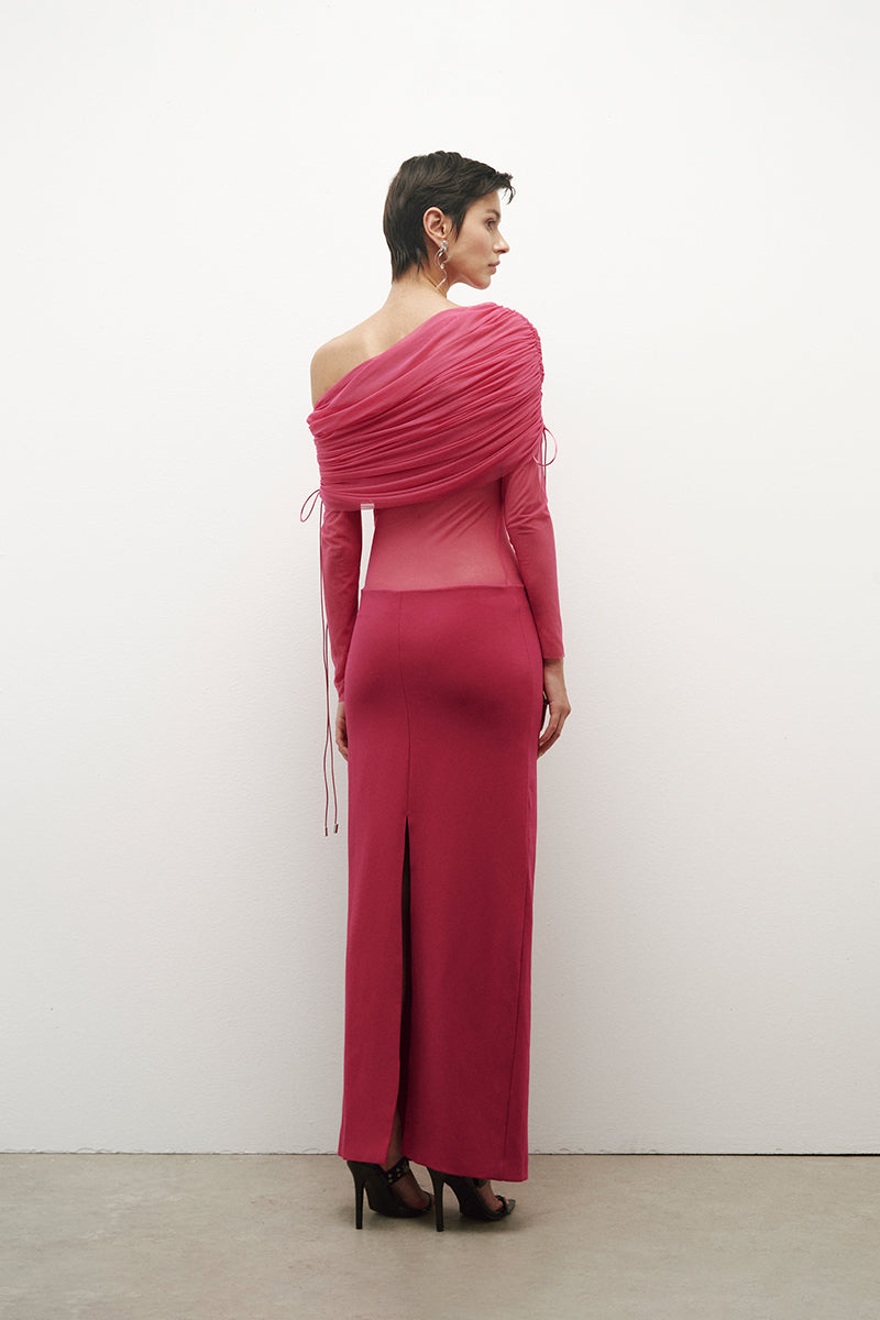 - فستان فوشيا من قماش التول والكريب المرن مع فتحة رقبة منسدلة