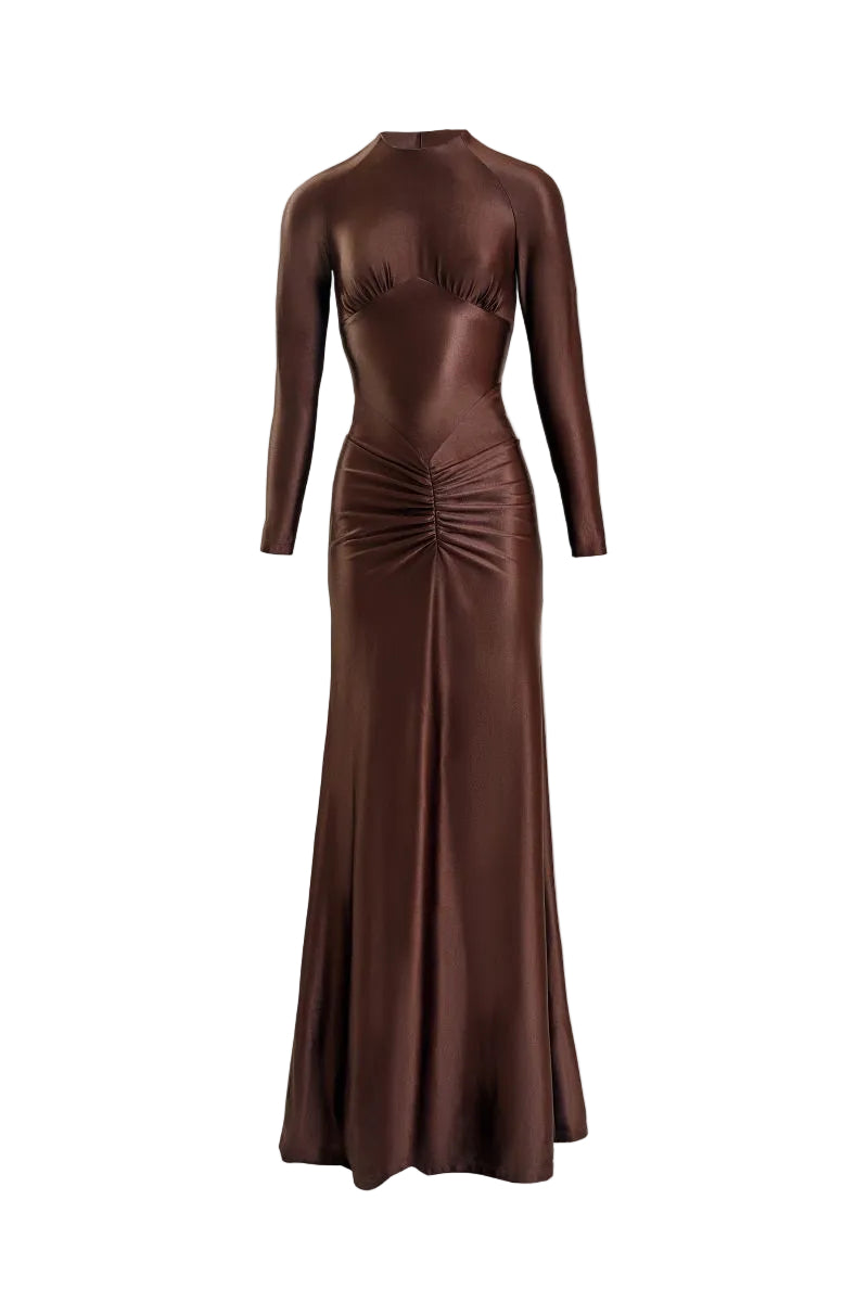 فستان بأكمام طويلة مصنوع من قماش جيرسي مطاطي لامع بلون بني صدئ، يتميز بياقة عالية، وتفاصيل خياطة زاوية عند الصدر، وتجاعيد في منتصف الجزء الأمامي.