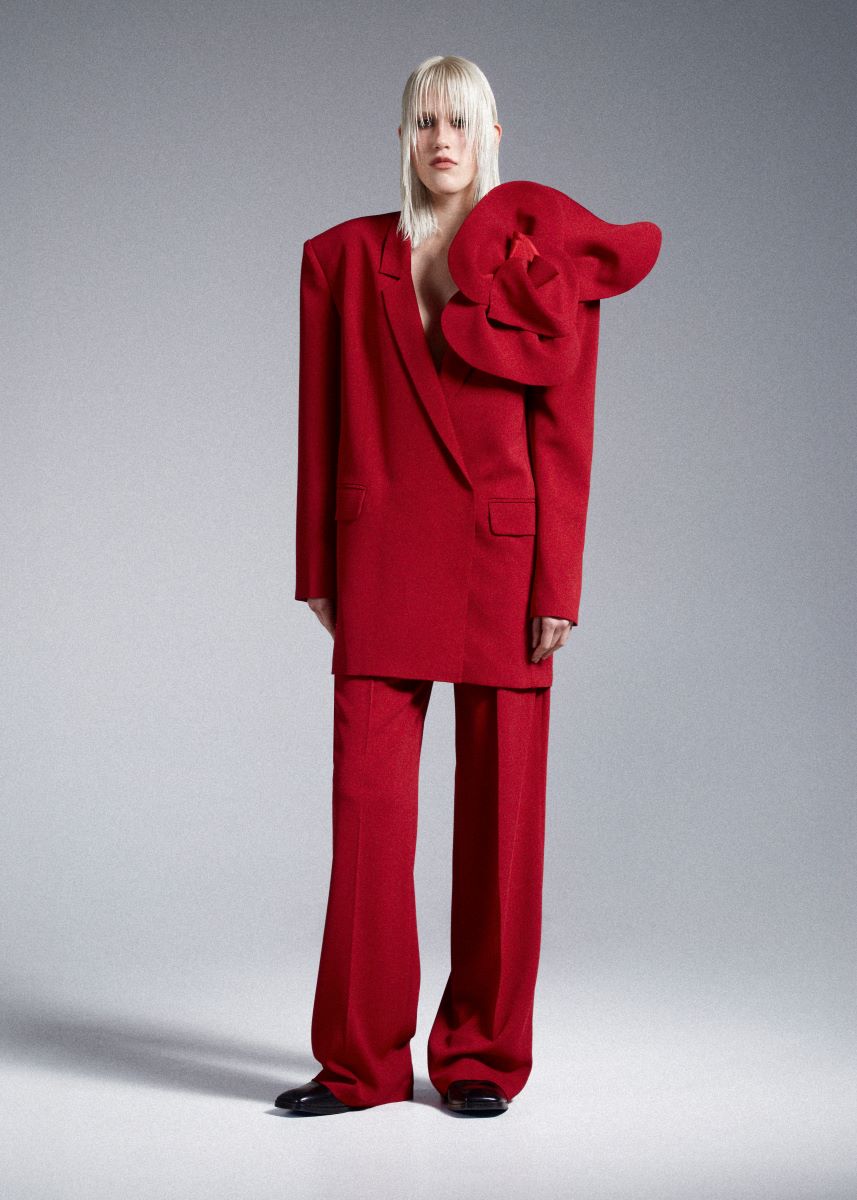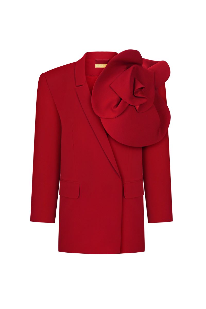 سترة حمراء كبيرة الحجم، مزدوجة الصدر، مزينة بزهرة كبيرة. إغلاق أمامي مخفي. مبطنة بالكامل.