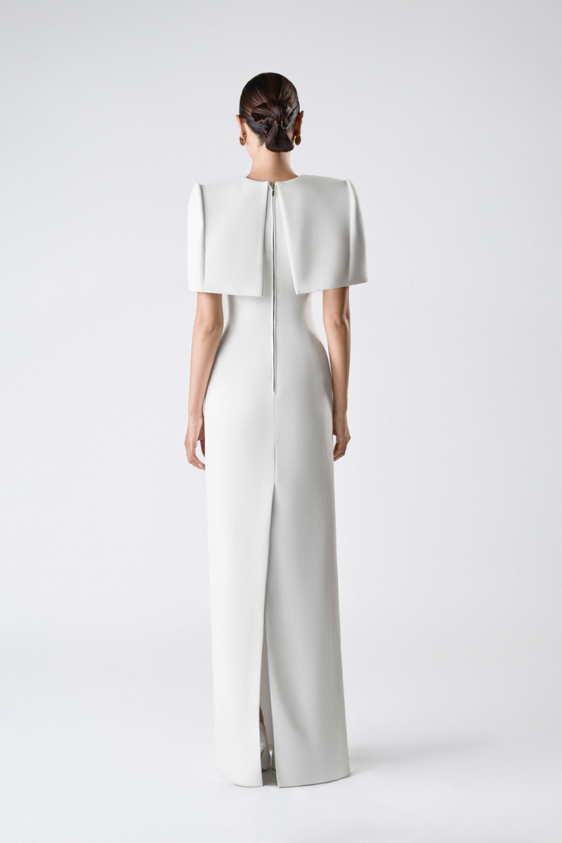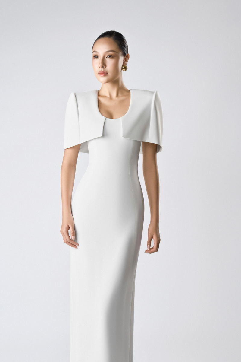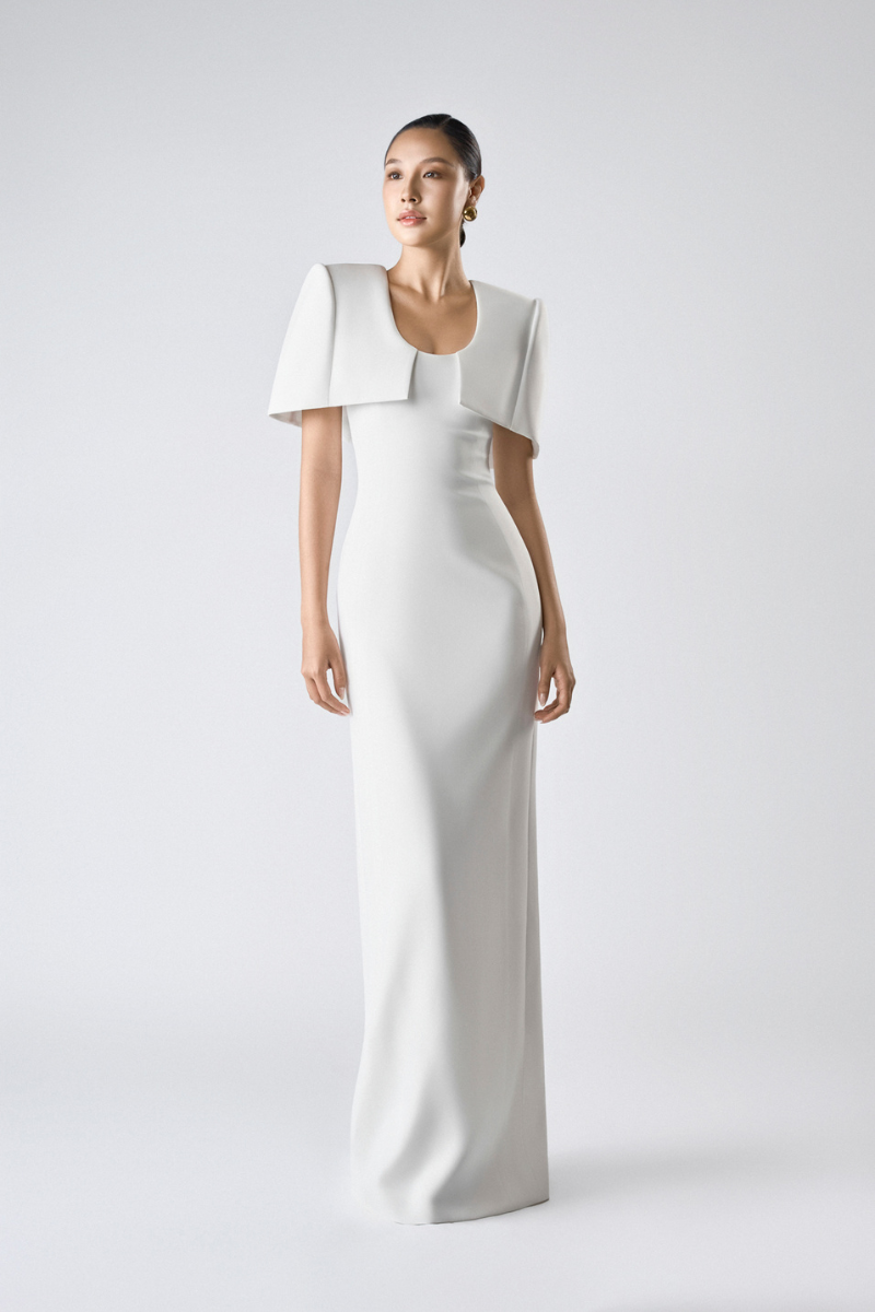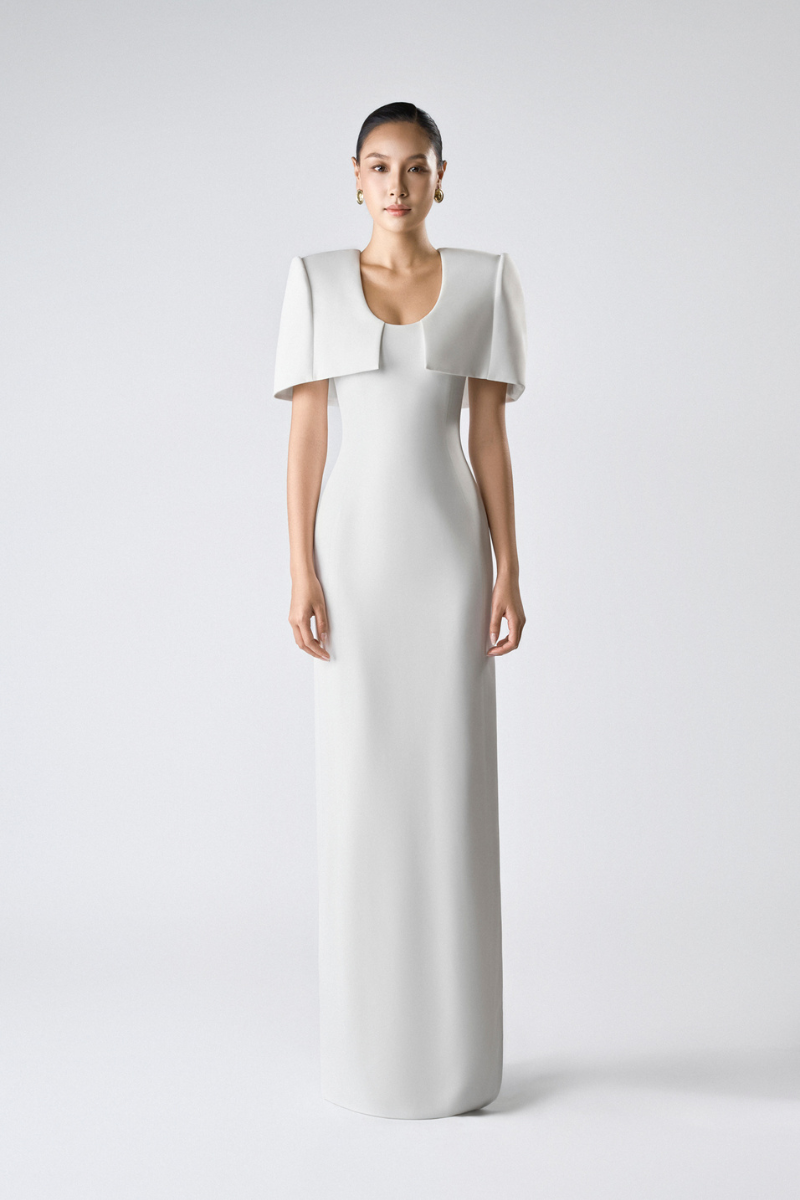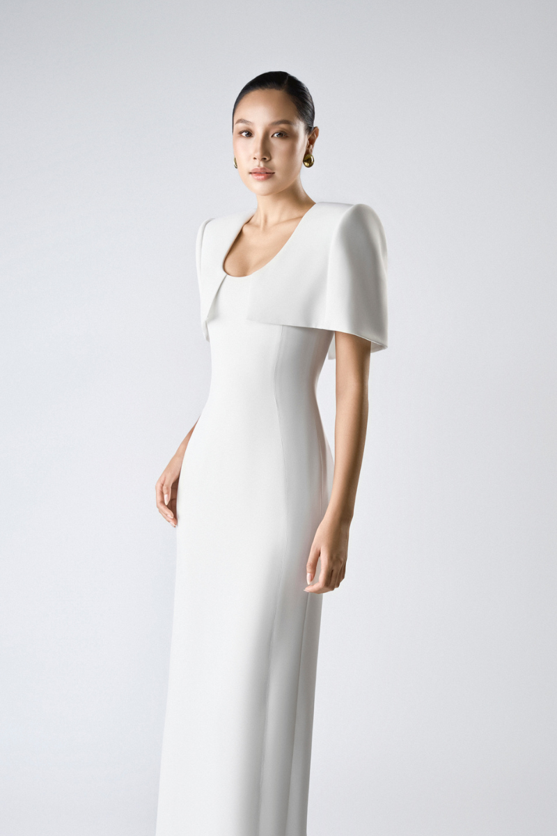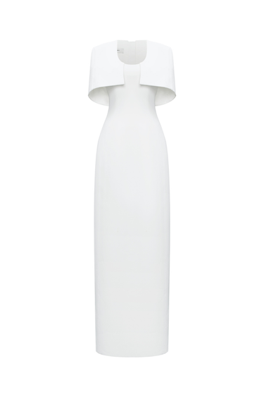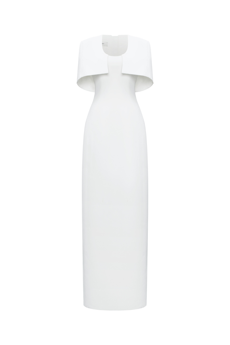 مصنوع من كريب مطاطي فاخر لشكل أنيق مع الحفاظ على راحة الحركة. عباءة الكتف المُهيكلة مصممة بعناية للحفاظ على شكلها الأنيق، مما يُضفي لمسةً بصرية جريئة وأنيقة. مبطنة بالكامل بالحرير الناعم لملمس ناعم على البشرة.
