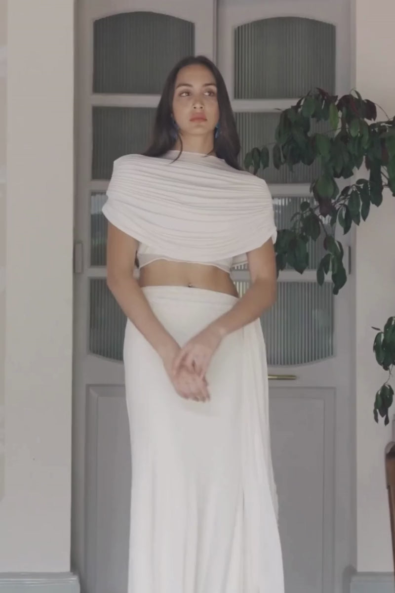 This elegant off white skirt and top set features a soft, bold, pleated mesh top with twisted rope detailing and tassels, and a dress net for a refined yet contemporary statement, making it a perfect choice.