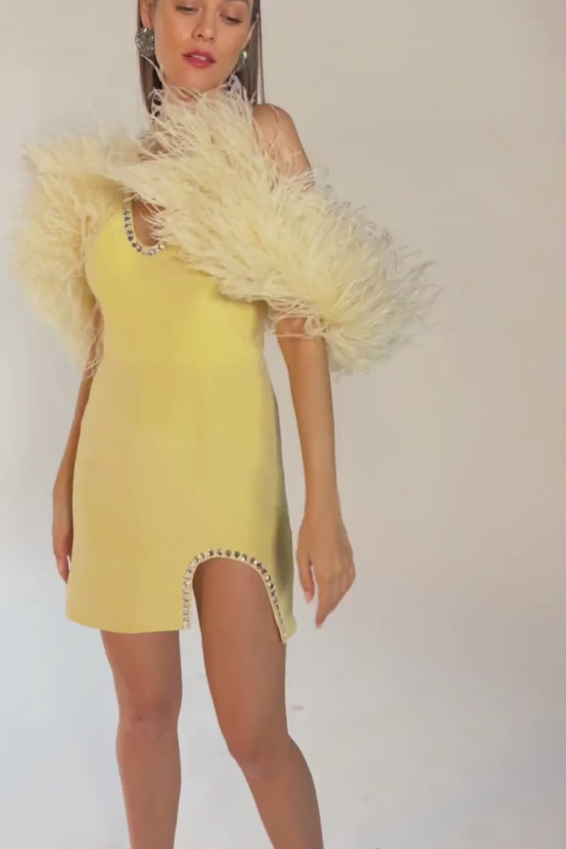 Completed with ostrich feathers and crafted in a pastel lemon yellow, the