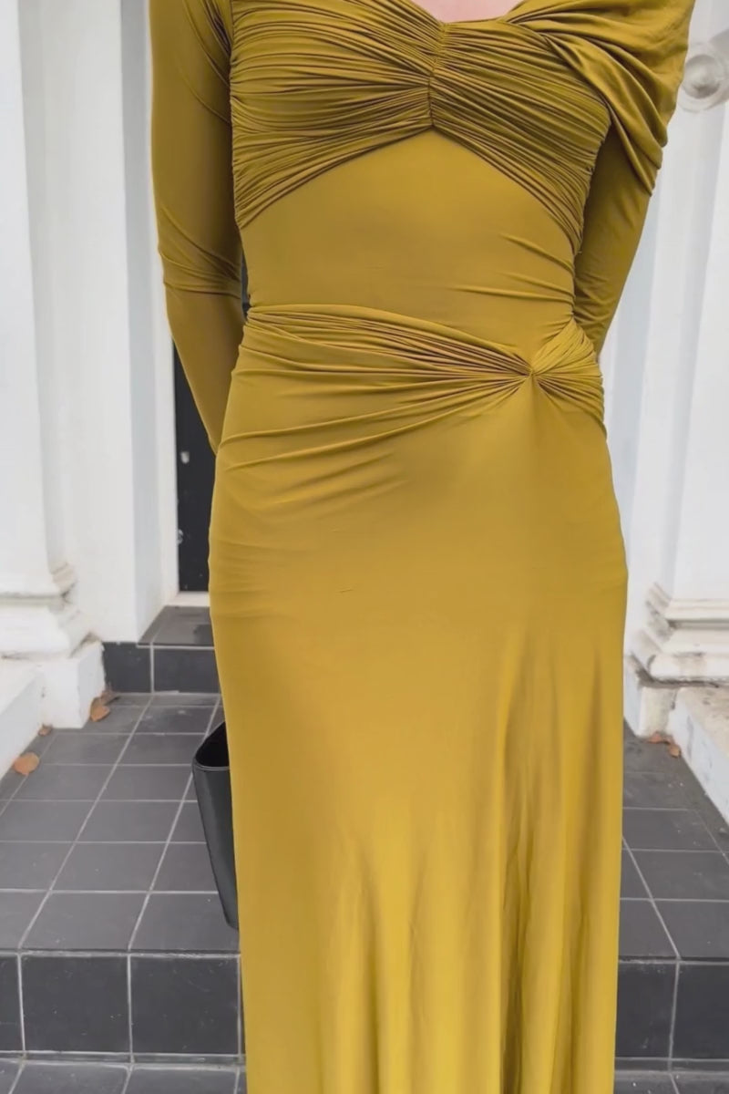 Introducing a dress of timeless grace and flowing beauty. With full-length sleeves that exude an air of elegance, this gown is designed to captivate. The bodice and waist are expertly draped, creating a fluid and enchanting silhouette that flatters every curve. With its sophisticated design and attention to detail, this dress is a stunning choice for any event.