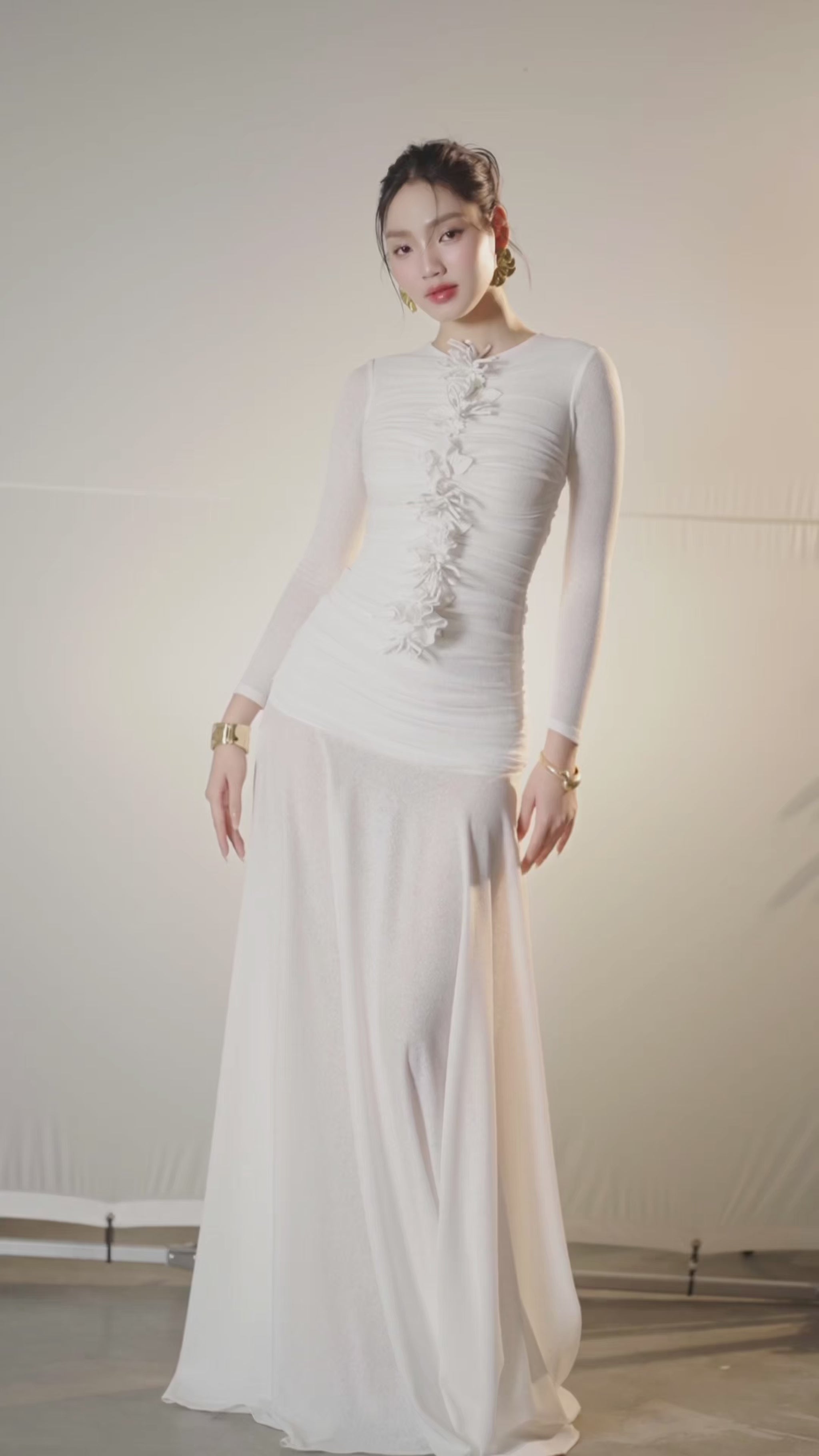 - A full-length dress in ivory, crafted from stretch fabric with gathered ruching along the body. - The design focuses on a form-fitting silhouette that enhances the figure and highlights natural curves. - Delicate hand-applied floral embellishments run down the length of the dress, adding just the right amount of detail—balancing minimalism with refined craftsmanship.