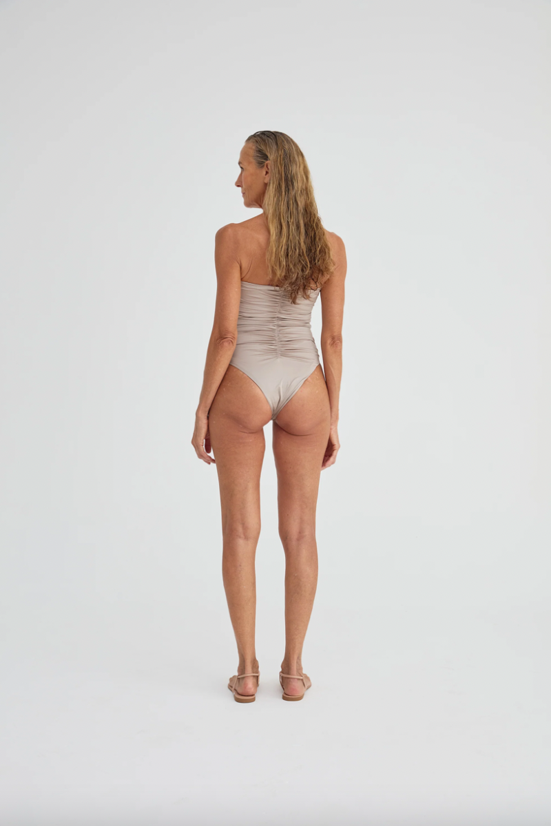 Draped bodysuit. Its intense copper tone enhances the skin with a warm glow, evoking the glow of embers at dusk.