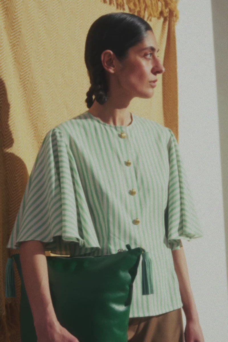 Semi–fitted blouse with a round neckline. Features voluminous sun sleeves and decorative brass buttons