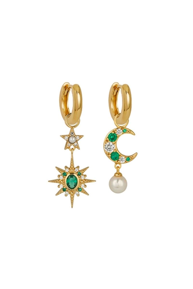 Our mismatched Moon and Star Motifs are embellished with a Faux Pearl, Emerald Green and Clear Cubic Zirconia, watch them sparkle as you move.