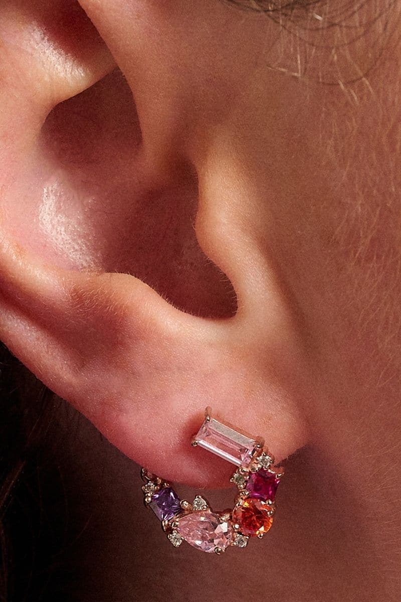 Clustered Cubic Zirconia in a spectrum of opulent colours make our Lottie earrings a WOW worthy gift. The sideways swirling silhouette make for the most amazing ear adornments! Elegantly crafted in Recycled 925 and plated with 18k Rose Gold, our vibrant 'Disco' colour way includes Clear, Rose Pink, Amethyst, Orange and Fuchsia Cubic Zirconia combinations.