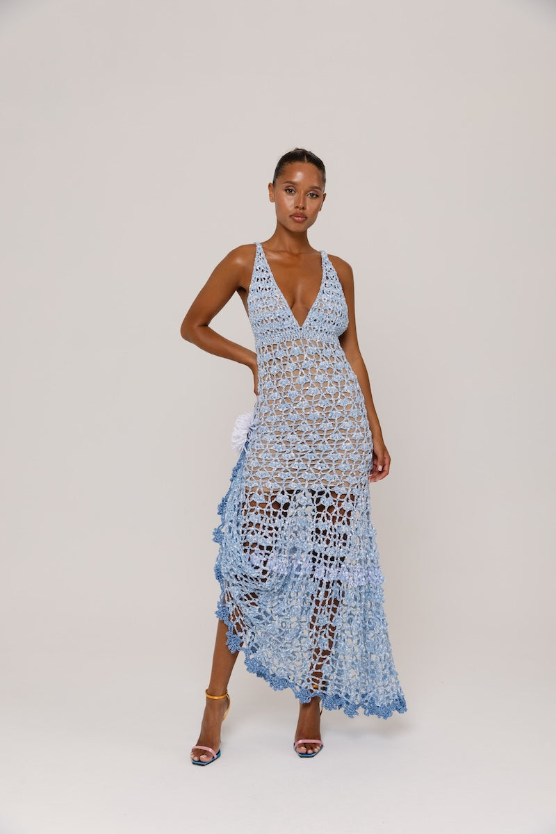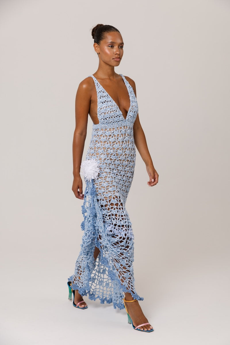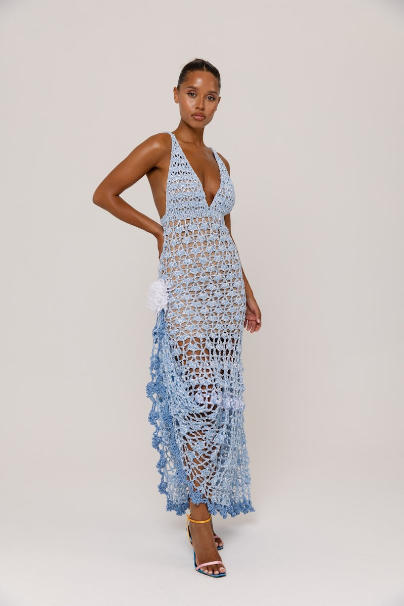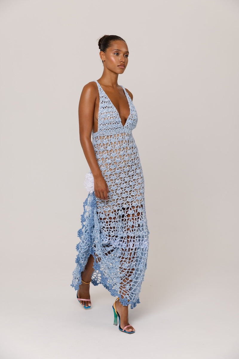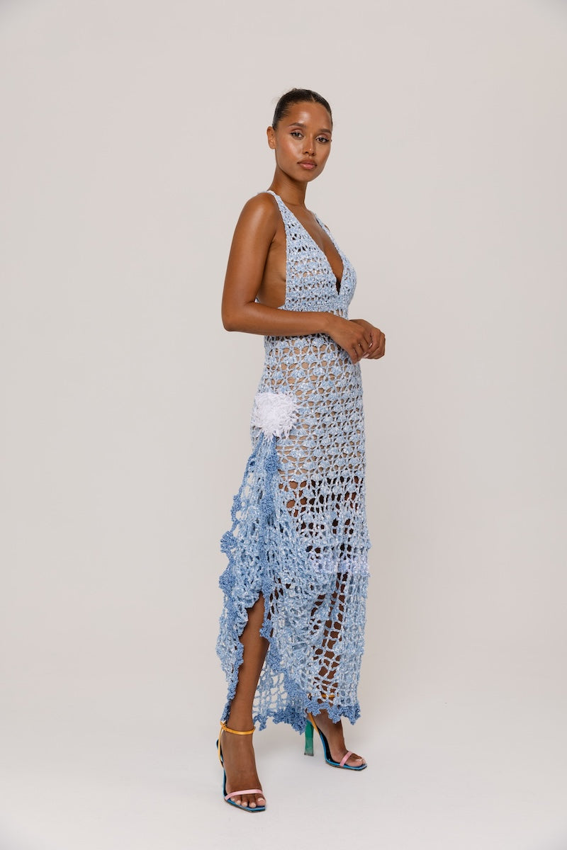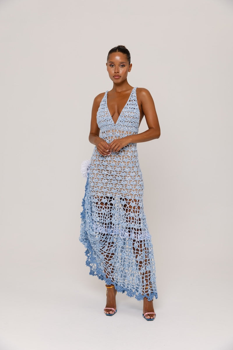 The Metallic Iris Handmade Crochet Dress features an open back and a flattering V-neckline. This elegant maxi evening dress is ideal for the holiday season or any special occasion, ensuring you stand out with its unique, handcrafted charm.