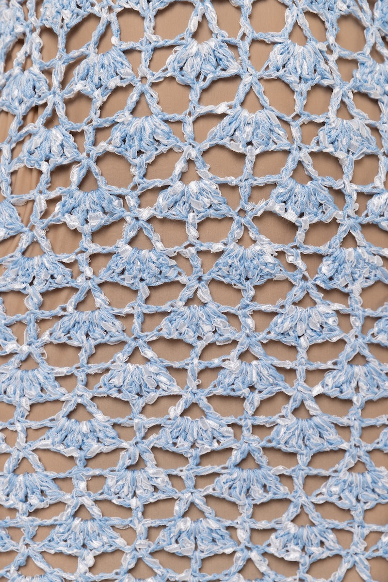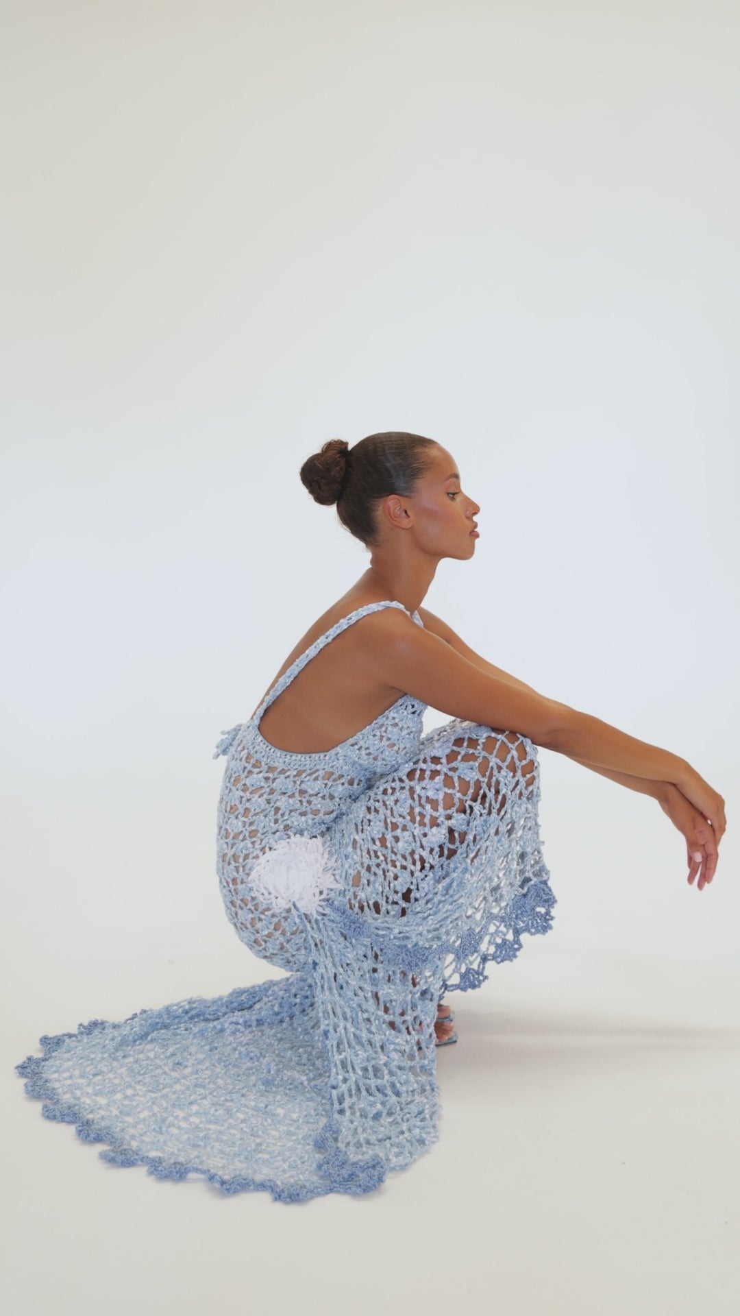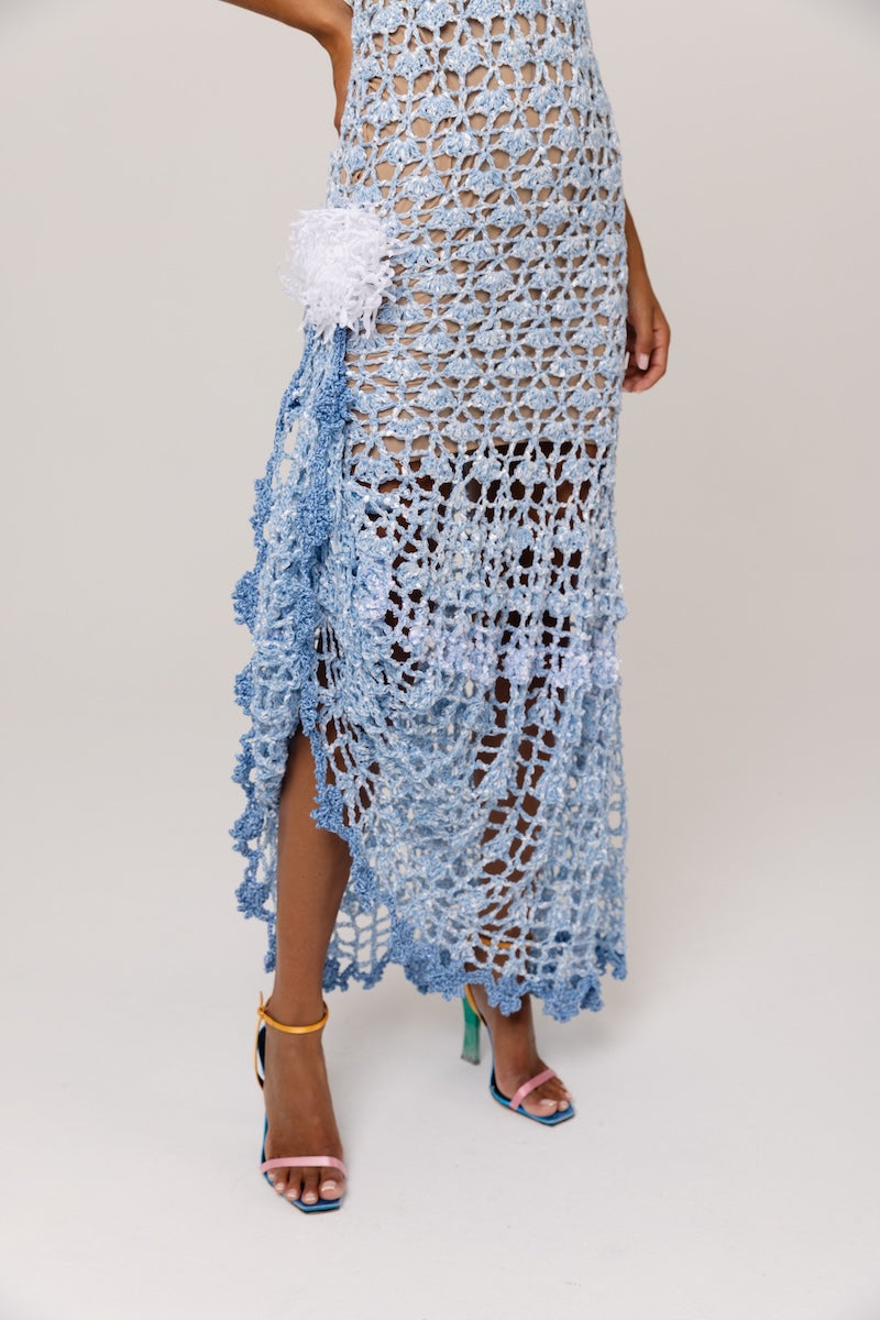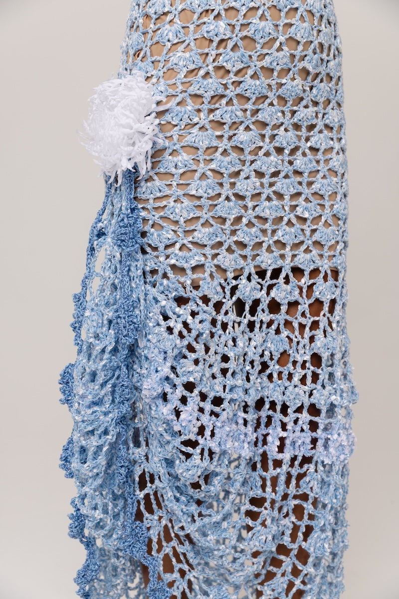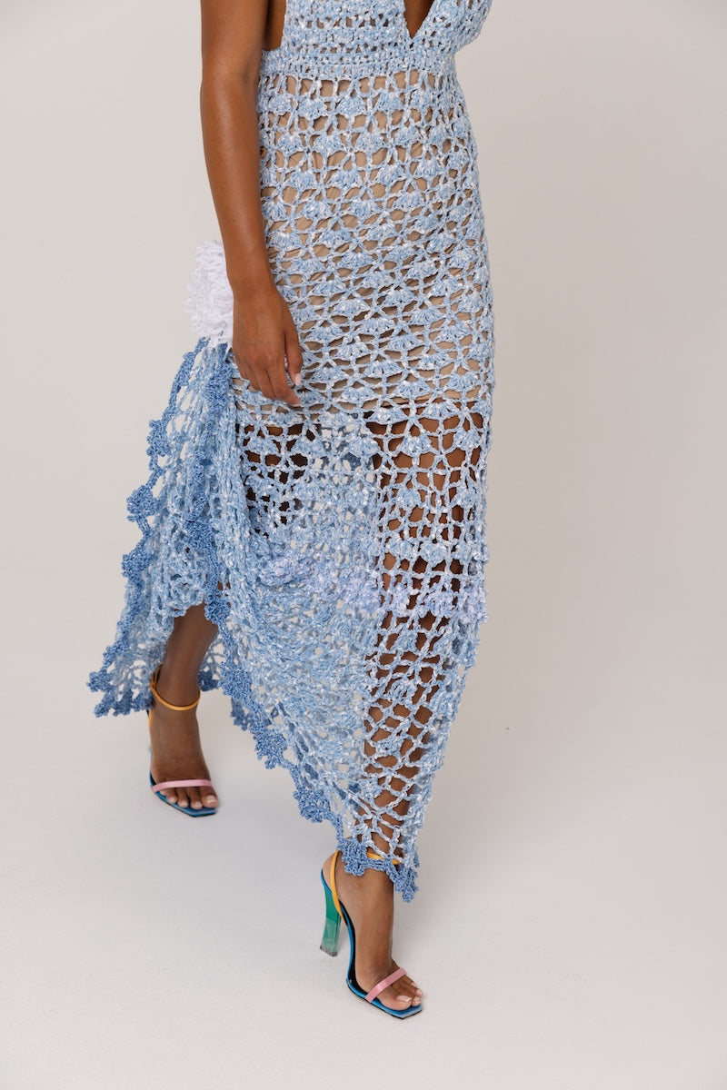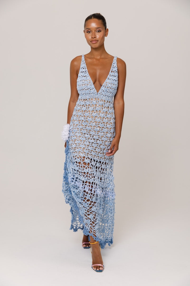 The Metallic Iris Handmade Crochet Dress features an open back and a flattering V-neckline. This elegant maxi evening dress is ideal for the holiday season or any special occasion, ensuring you stand out with its unique, handcrafted charm.