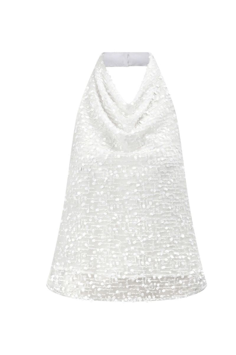 The halter-neck top accentuates the wearer's elegant shoulders, while the delicate tied bow adds a feminine touch. The unique sequin fabric enhances its striking appeal.