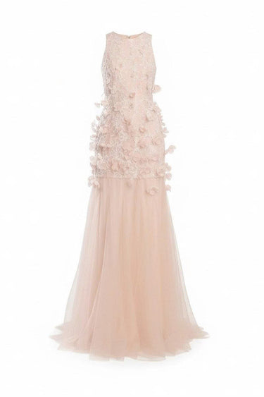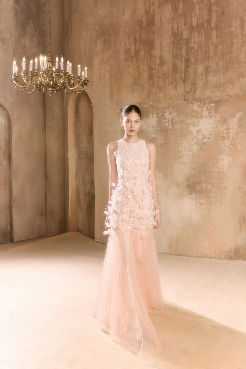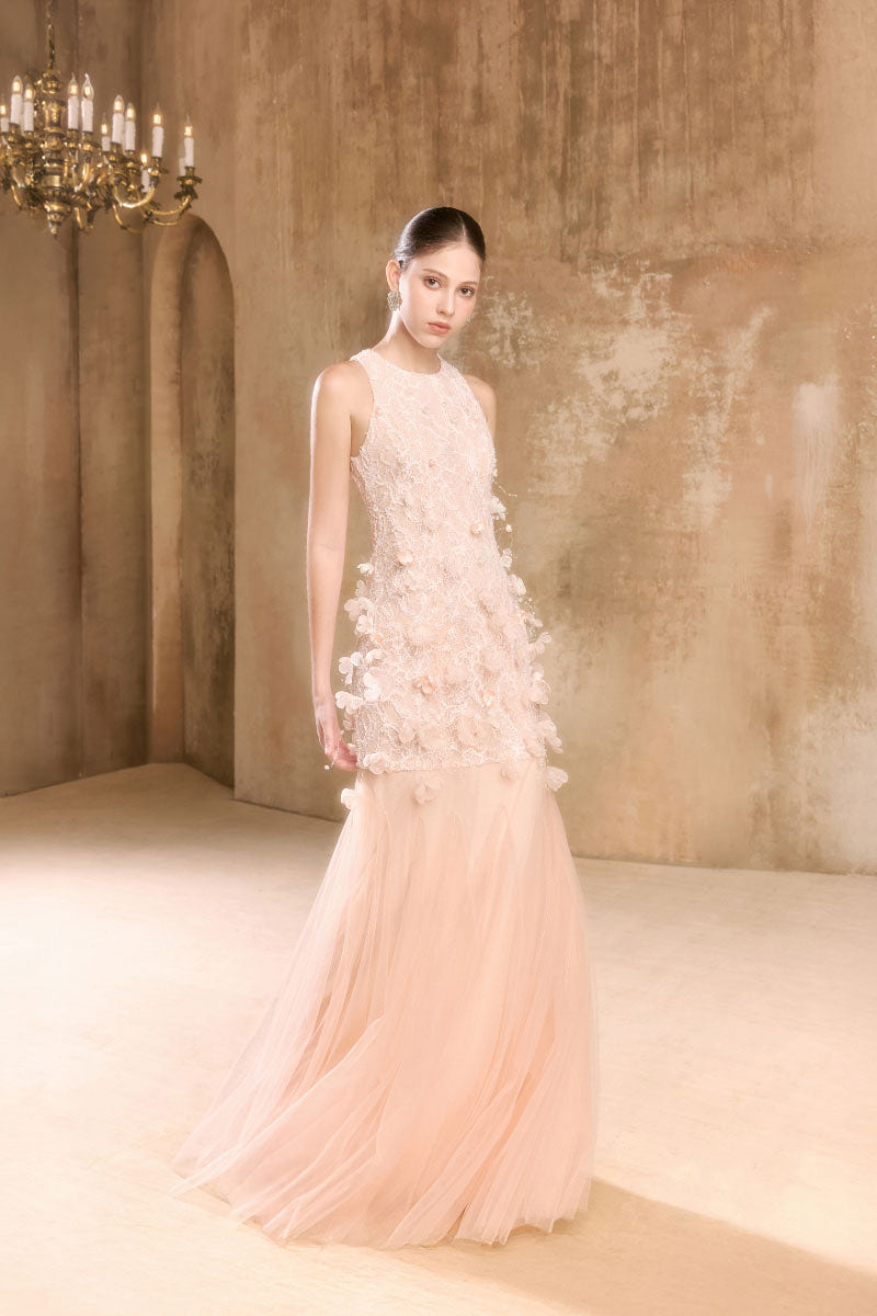 - Handcrafted 3D floral appliqué composed of over 100 individually assembled blossoms, accented with delicate beading for a subtle shimmer
